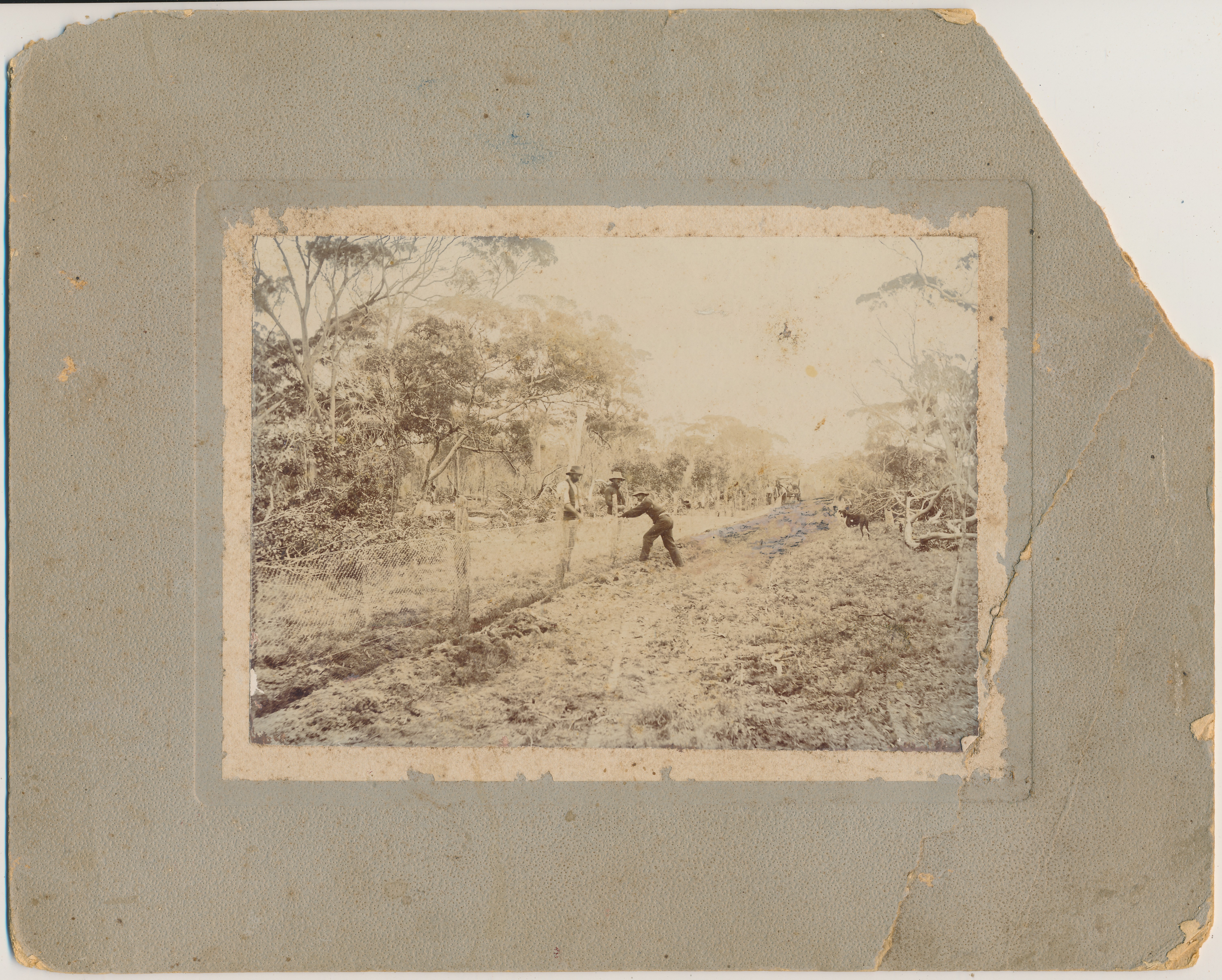 c. 1903A sepia photograph of men building a fence. In the foreground are three men standing either side of the fence. In the background are men unravelling the fence, and behind them is a truck.