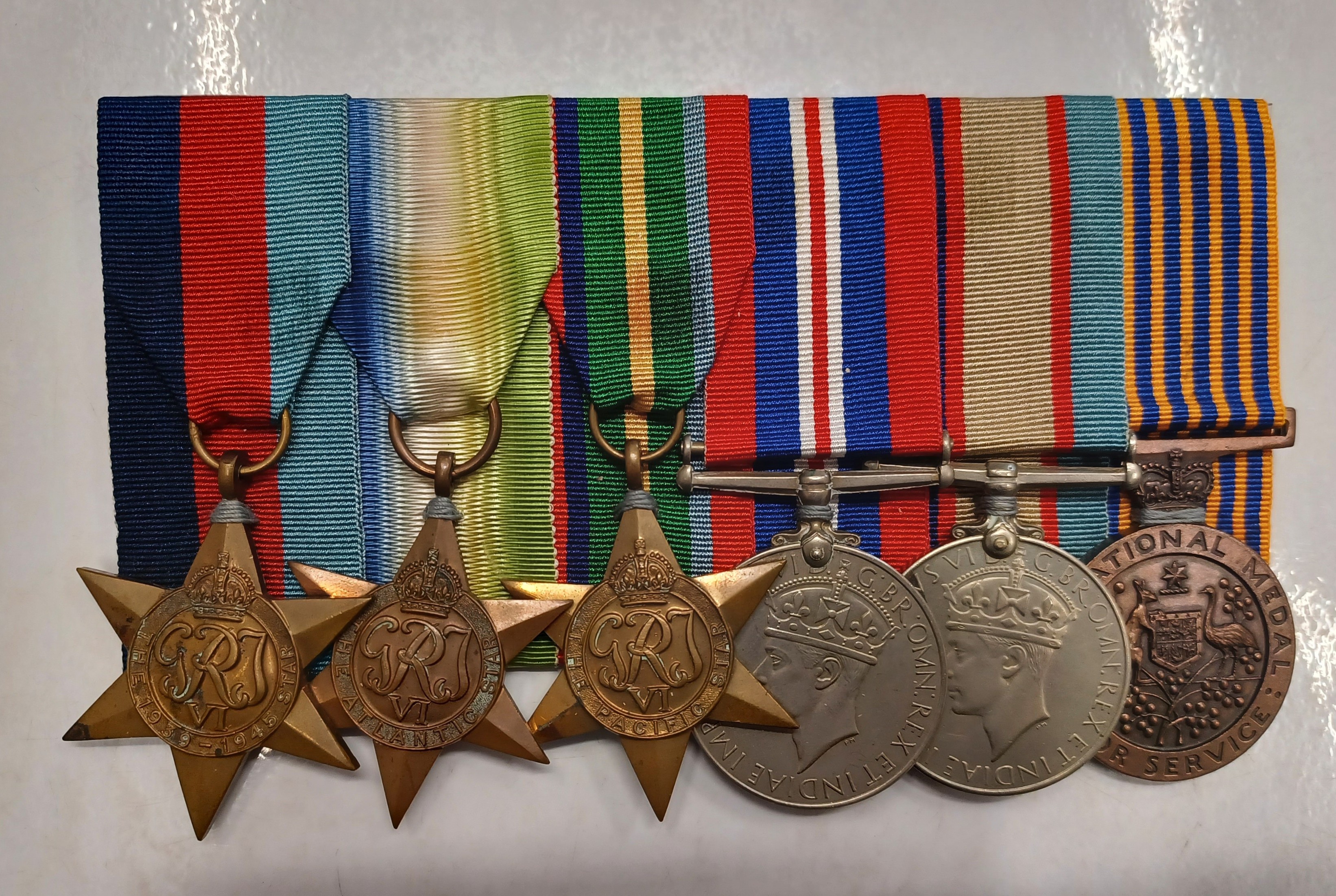 Three star shaped bronze medals, two round silver medals and one round bronze medals attached to coloured ribbons sewn on a board.