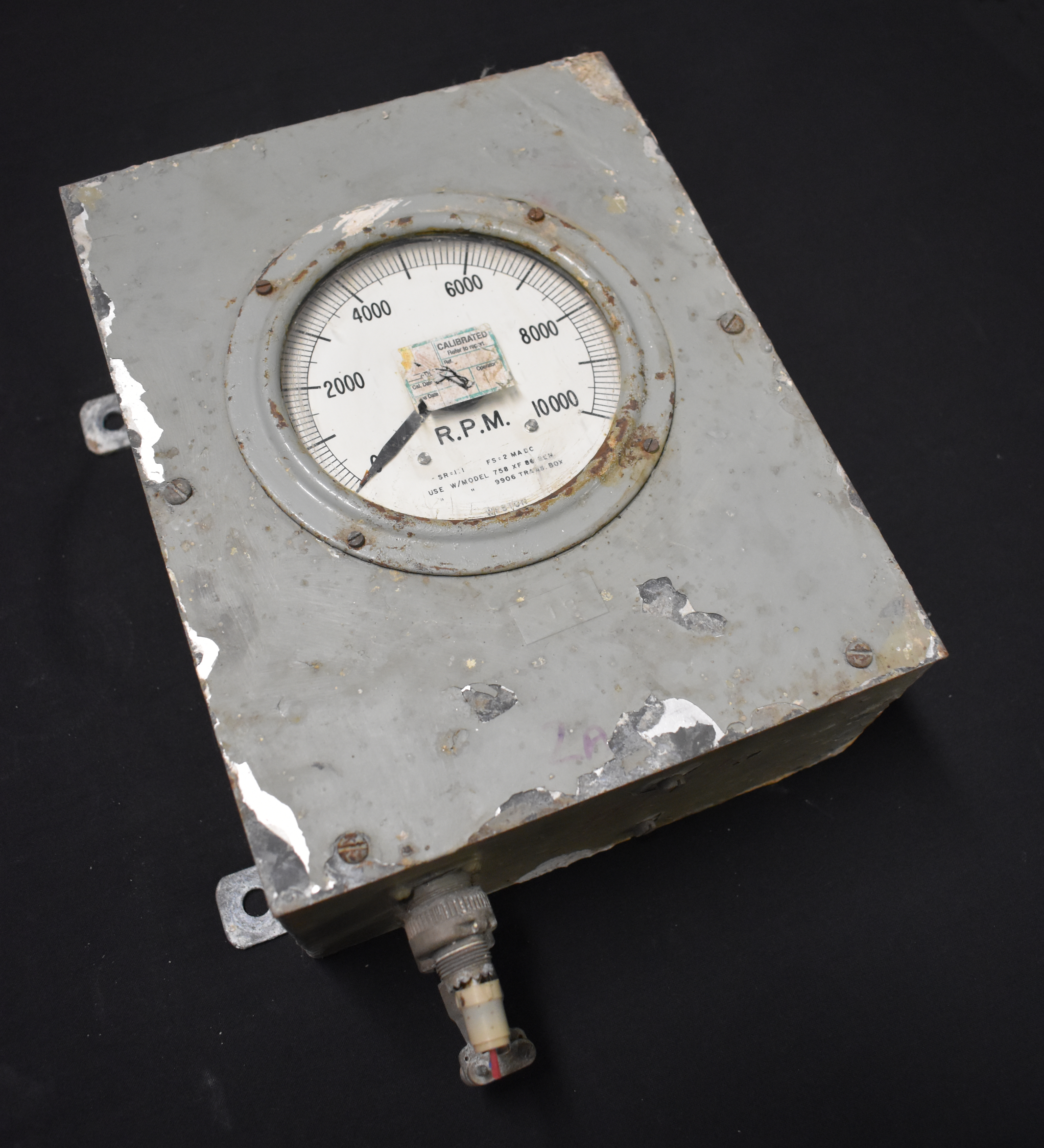 On dial in black "WESTON / MODEL 954FD / O - 2000 - 4000 - 6000 - 8000 - 10000 / R.P.M. / SR=1:1 FS:2 MADC / USE W/MODEL 758 XF 86 GEN. / " " 9906 TRANS BOX" with "ADI / CALIBARTED / Refer to report / Ref. Cl. Date / Due Date / Operator" on small adhesive label on glass.