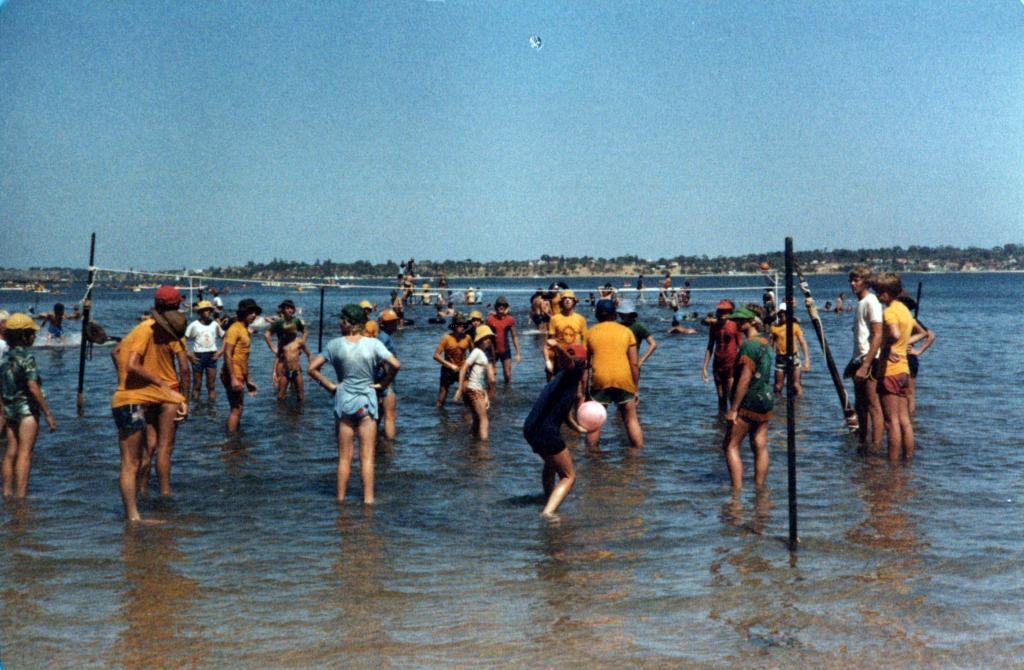 Coloured photograph: Photograph of a large group of male scouts playing volleyball in ankle-deep water. Many of the participants are wearing yellow shirts. In the background, a sandy bank can be seen and other figures playing water sports.