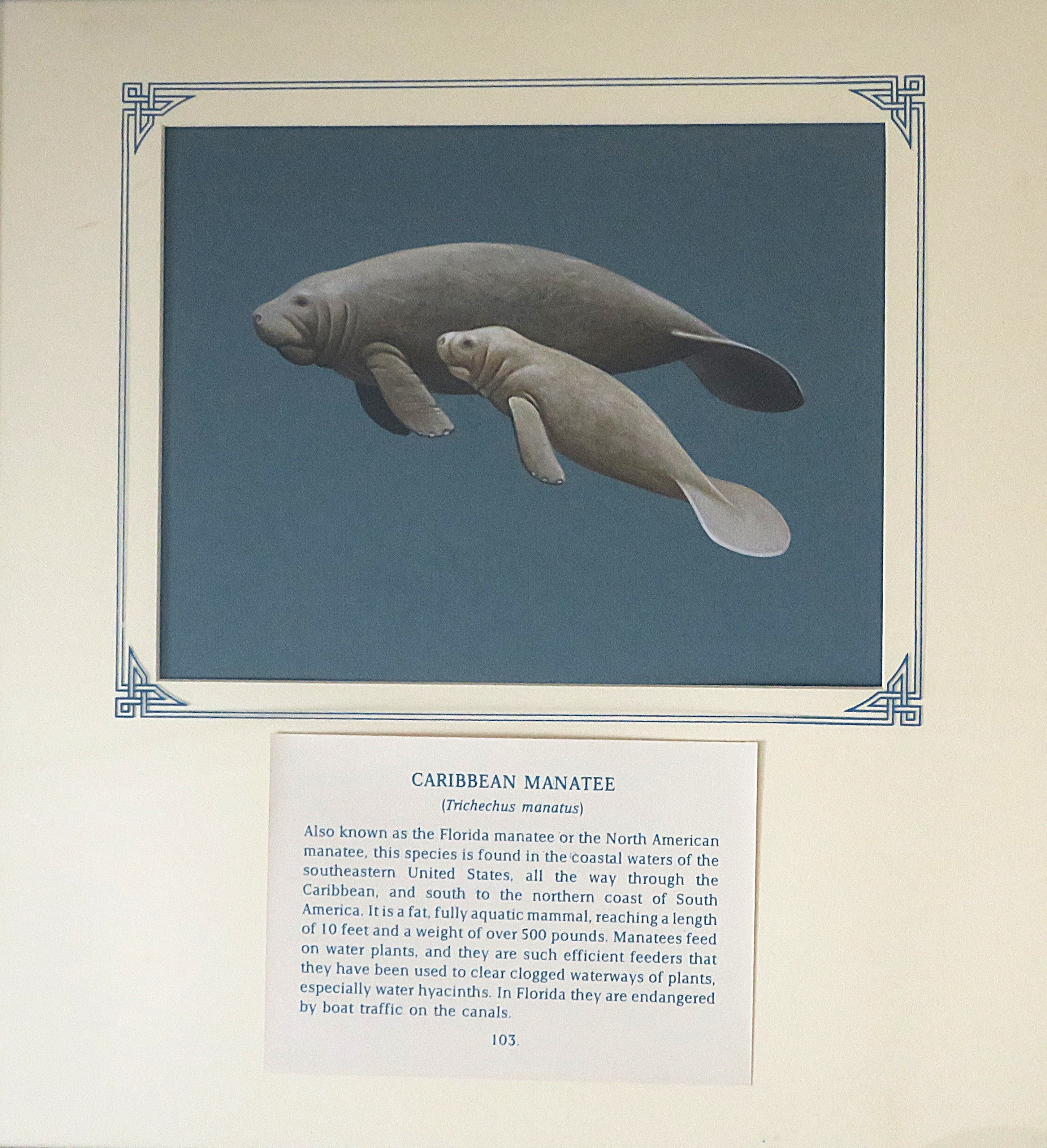 Also know as the Florida manatee or the North American manatee, this species is found in the coastal waters of the southeastern United States, all the way through the Caribbean, and south to the northern coast of South America. It is a fat, fully aquatic mammal, reaching a length of 10 feet, and a weight of over 500 pounds. Manatees feed on water plants, and they are such efficient feeders that they have been used to clear clogged waterways of plants, especially water hyacinths. In Florida they are endangered by boat traffic on the canals.