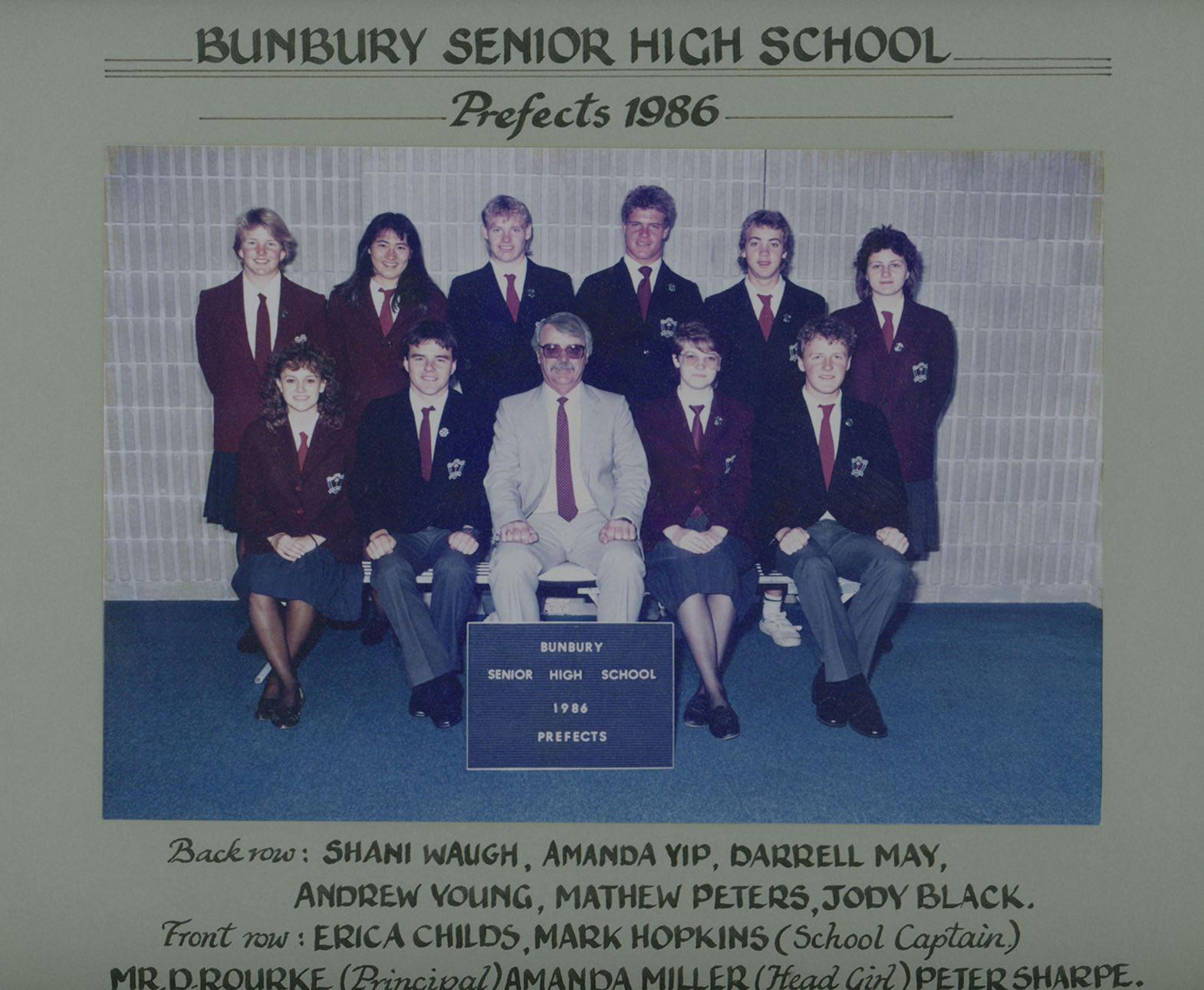 1986Group photograph of the 1986 Bunbury Senior High School Prefects with principal David Rourke.