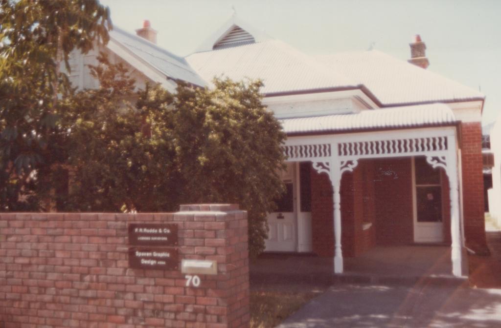 1985Coloured photograph of an unknown house in Subiaco. It is a red brick house. The house has a hipped roof. There is a gable to the left in the image. There are two chimneys on top of the roof. There is a bull nosed verandah with a tin roof supported by decorated white wooden beams. There is a white wooden decorative framework attached beneath the roof. There is a red brick wall in front of the left part of the house. The number '70' is seen on the brick wall. There are also two signs on the wall, reading 'F. R. Rodds & Co.' and 'Spaven Graphic Design'. There are trees and bushes in between the brick wall and the house, largely covering the left part of the house.