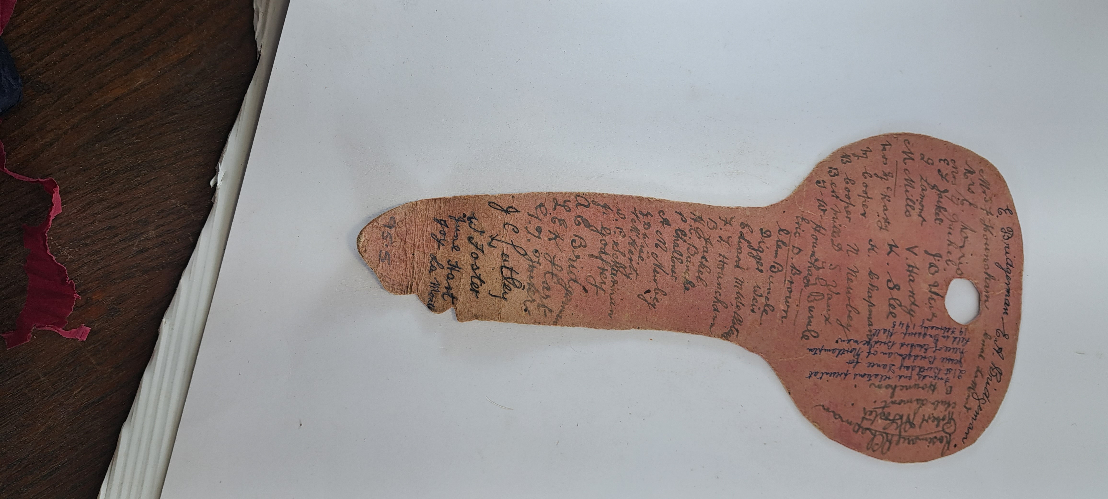 brown card key sharped with hand writing both front and back.