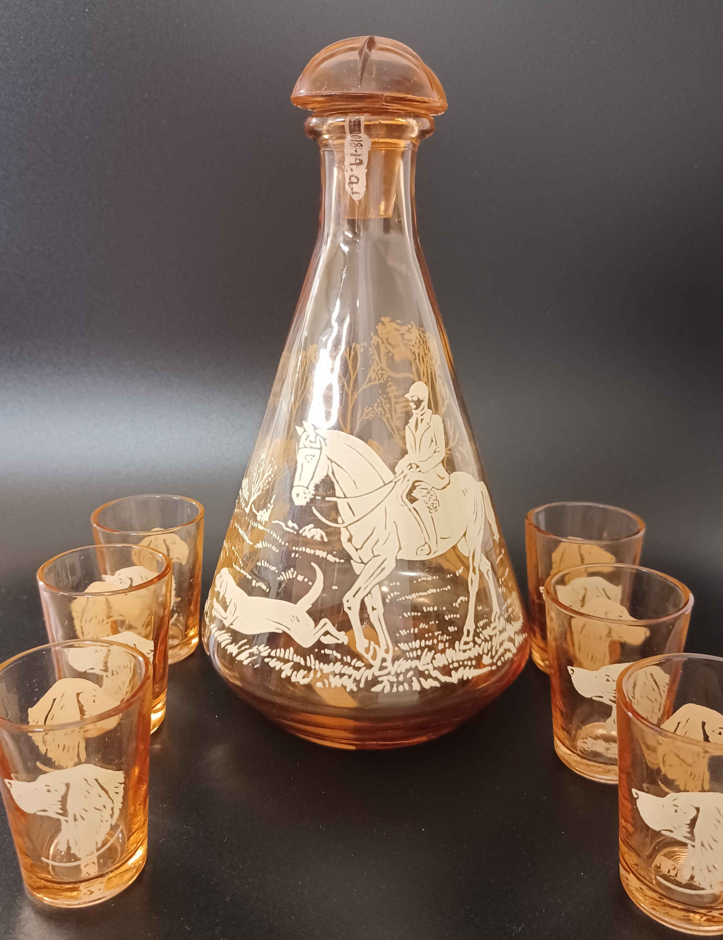 Part A. Hand blown peach coloured glass Decanter, illustrated with cream painted hunting scene that includes Huntsman on horse, two hounds and a fox, has a pontil mark on the bottom.