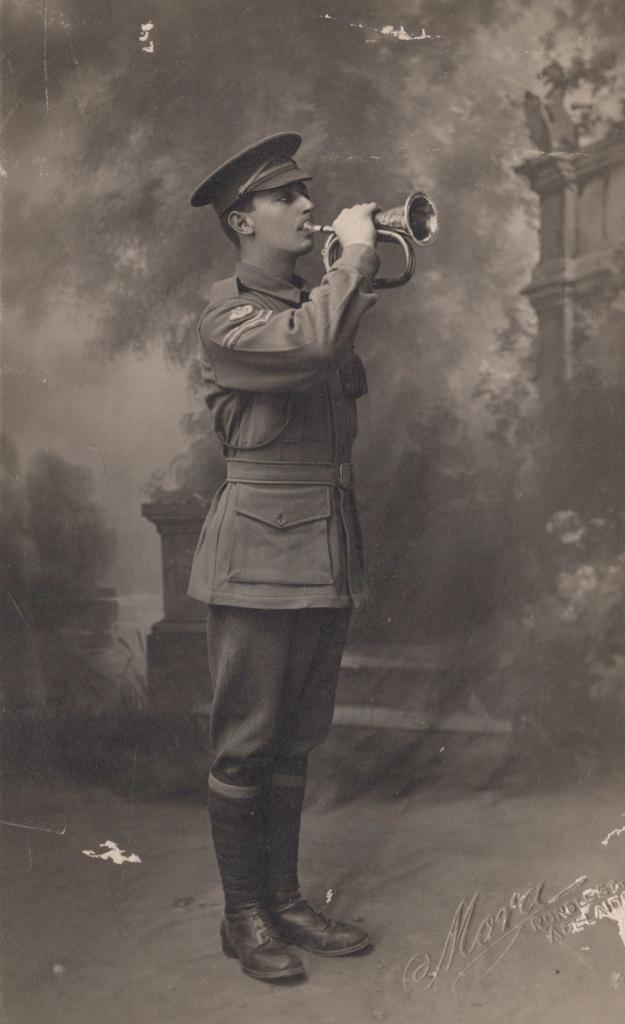 c. 1913Postcard showing an unknown man in uniform. He is holding on to an instrument.