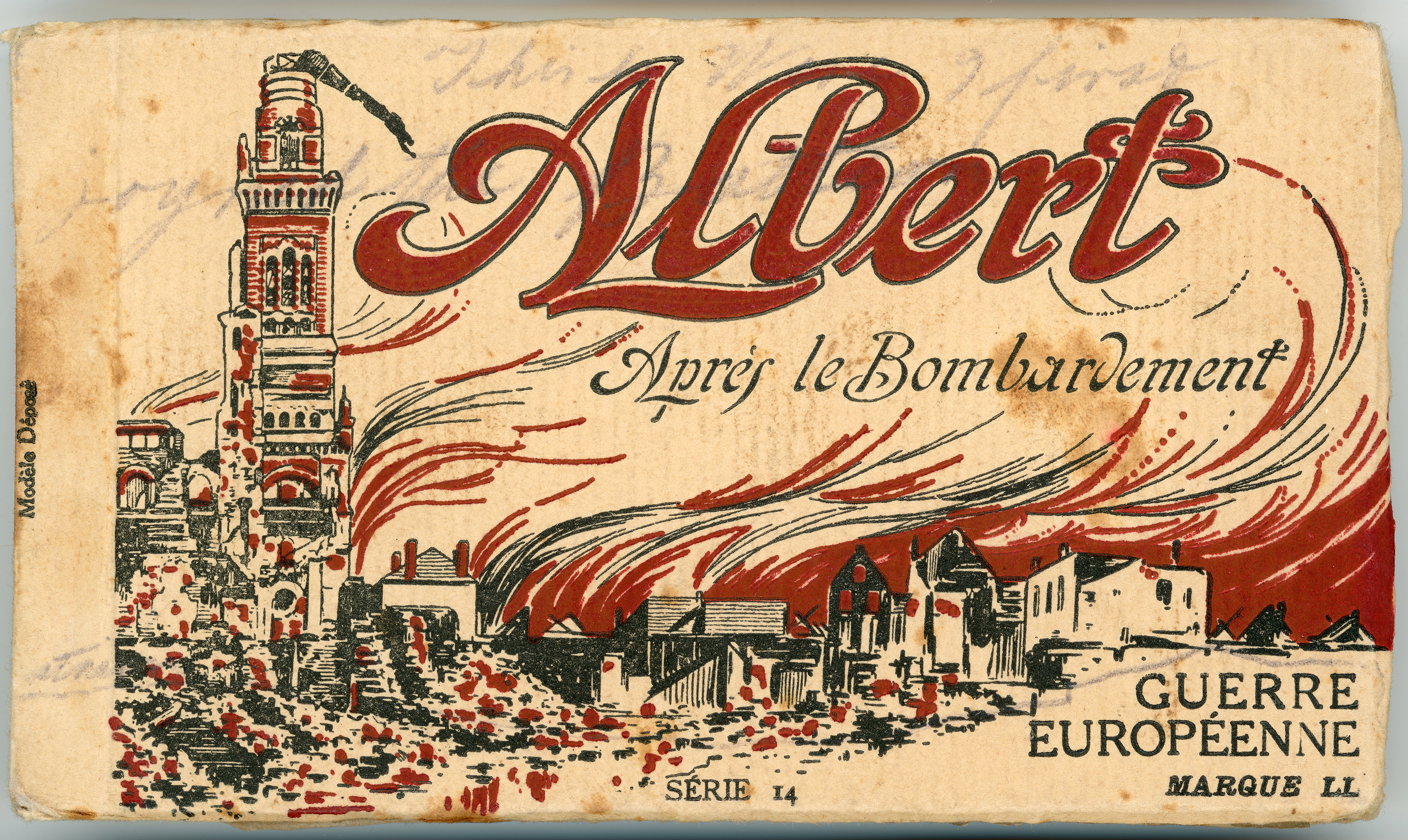 c. 1916First World War souvenir booklet of black and white photographic detachable postcards of the town of Albert in Northern France post war. Decorative front cover in red and black ink. Some barely discernible handwritten script in pencil on front cover.