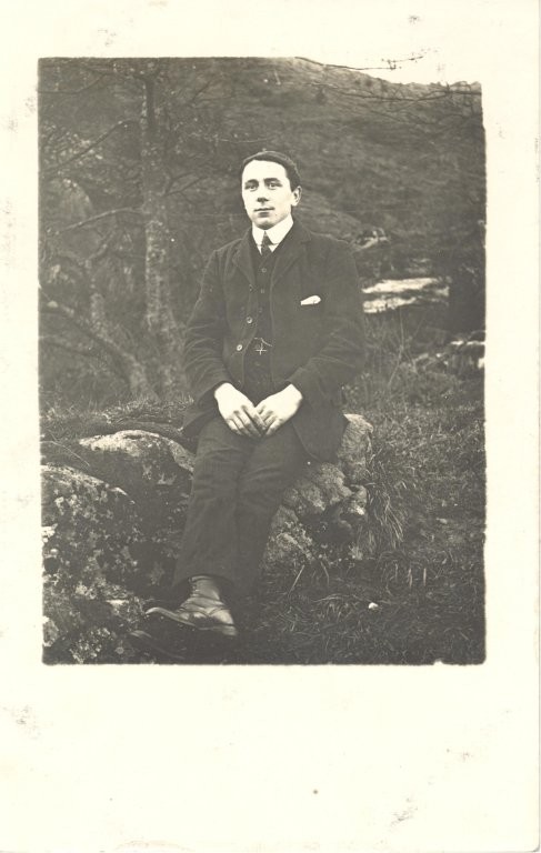 B/W photo of Jack Griffiths printed onto a post card. He is dressed in a dark three piece suit, stiff white collar and tie and has a white handkerchief in his breast pocket, watch chain with a cross and shiny, dark, heavy boots. He is sitting on a large rock with his feet crossed. The background is a steep rockface with patches shining with water.