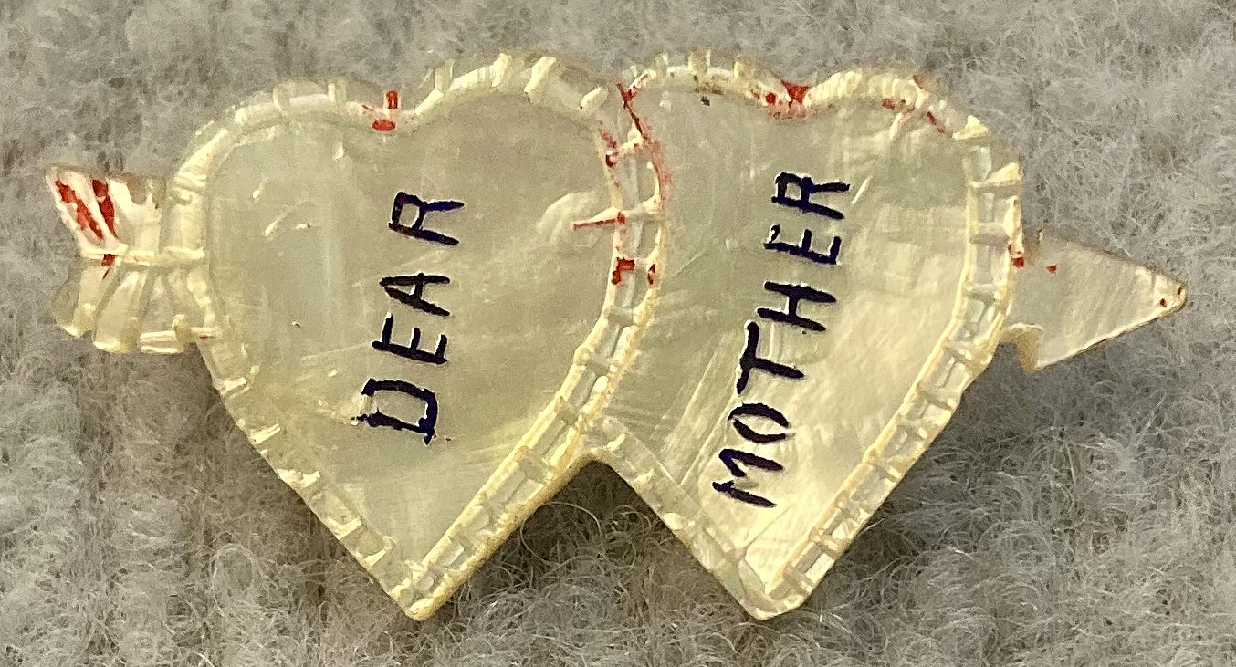 Mother of pearl hearts and arrow sweetheart brooch for 'Dear Mother'
