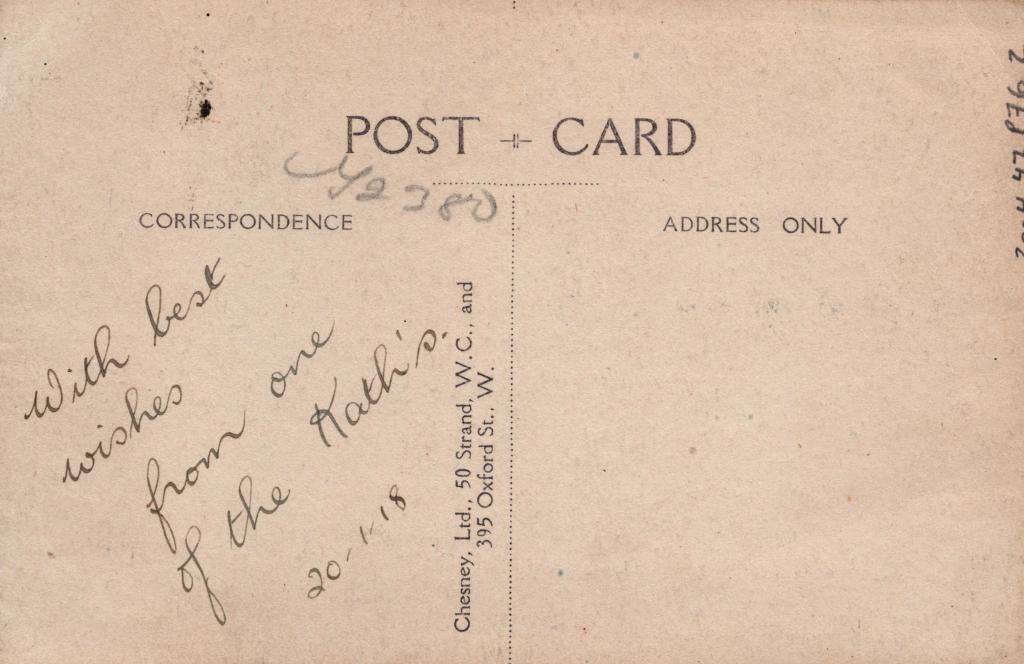 Reverse: Written in black pen 'With best wishes from one of the Kath's. 20-1-18'