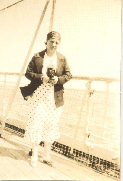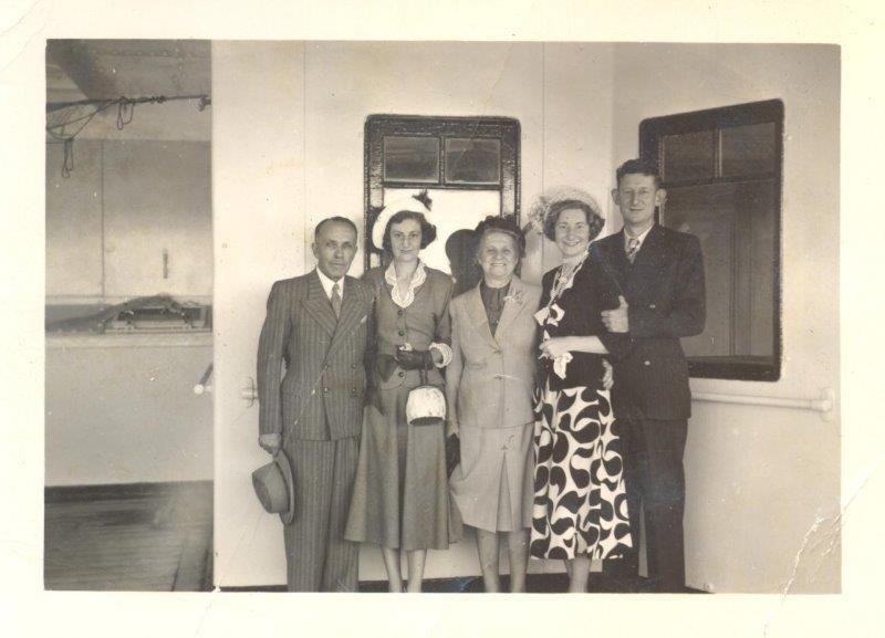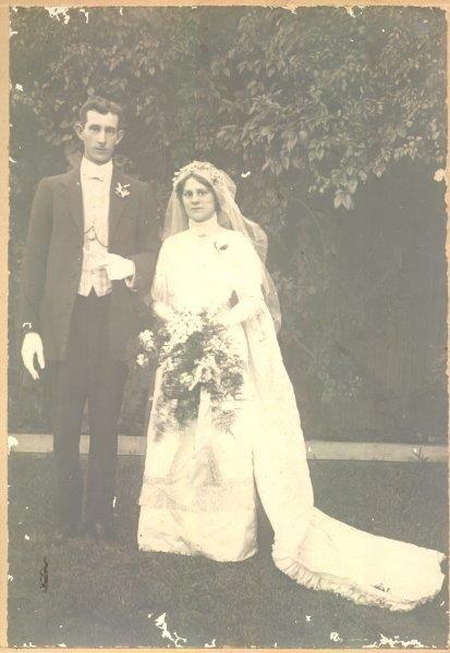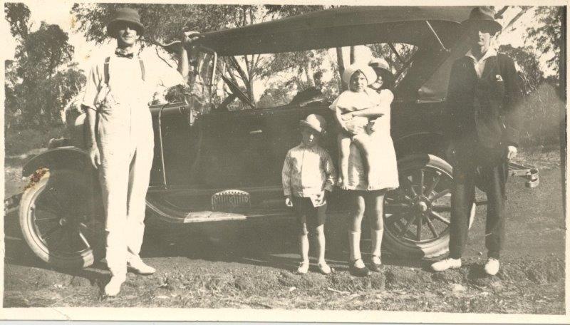 B/W copy prints. (a) William John Furniss in light shirt and trousers and dark hat standing beside a dark tourer car with his children; Ernest in dark pants and light blouse and hat, Rita in light outfit and bonnet being held by Verdun and Albert in dark suit and hat and white shoes. (b) Family group of Clarrie Hammond in dark suit, holding his hat, Rita In dark suit, white hat and handbag, Mercy in light suit and dark hat, Verdun in patterned skirt, dark top and light hat, and Albert in dark suit. (c) Mercy Hammond in spotted skirt, light blouse and dark jacket standing on the deck of a ship holding a camera. (d) William John Furniss in dark suit, white shirt, tie and gloves and Mercy Mary Maud Newton in long white frock and train, veil and large bouquet at their wedding in 1912 at Scholl Street, Mandurah.