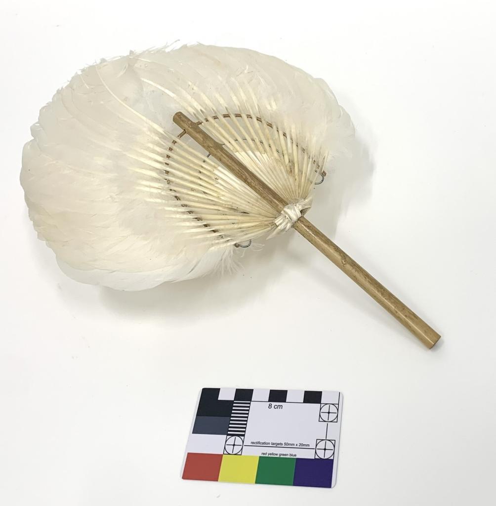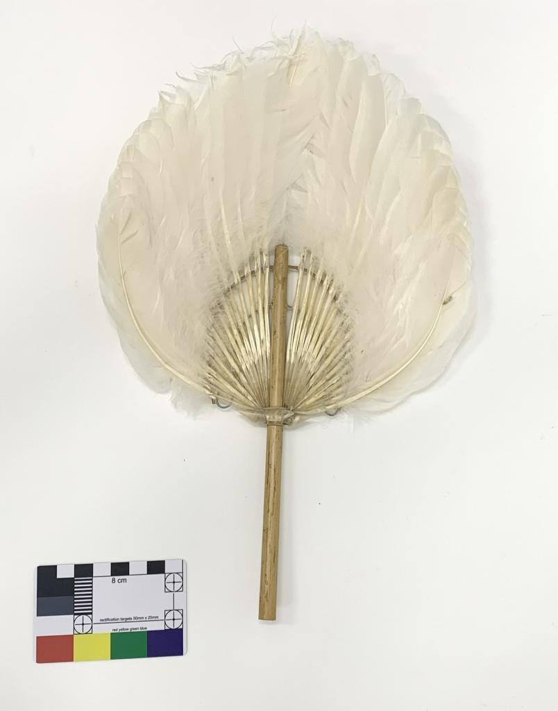c. 1920Female costume accessory. Fan made of 32 cream feathers attached to bamboo handle and supported by fine piece of cane and fine aluminium wire.