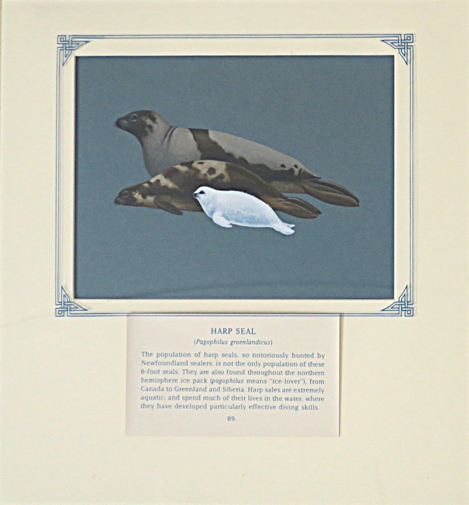 c. 1975Painting of two grey and brown bottled adult seals and white pup, gouache on blue card, framed and mounted with inscription (89)