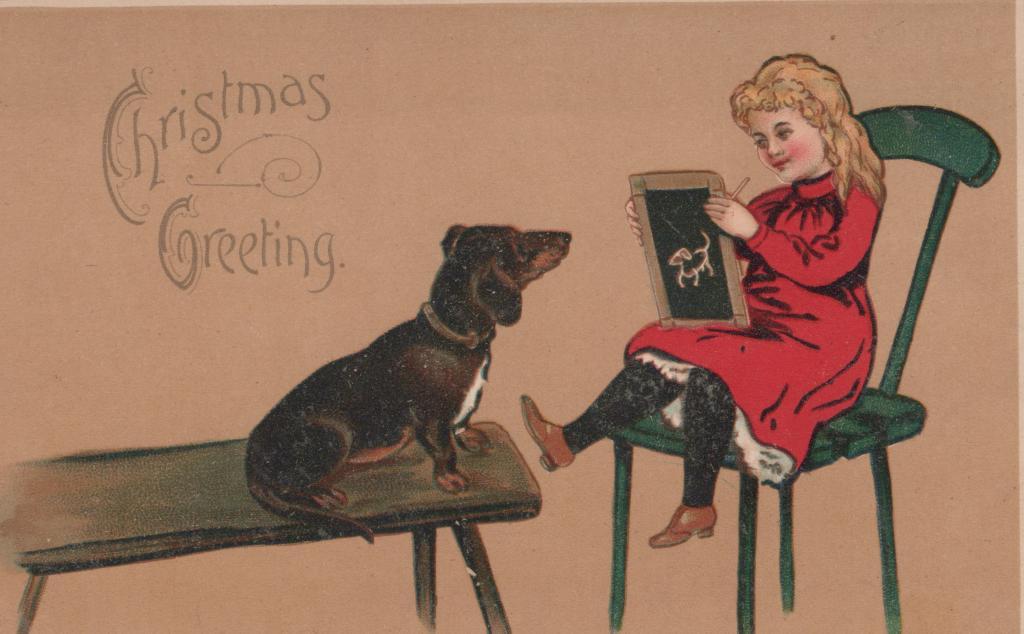 c. 1913Postcard showing a girl drawing a dog. The text 'Christmas Greeting' is seen in the top left corner.