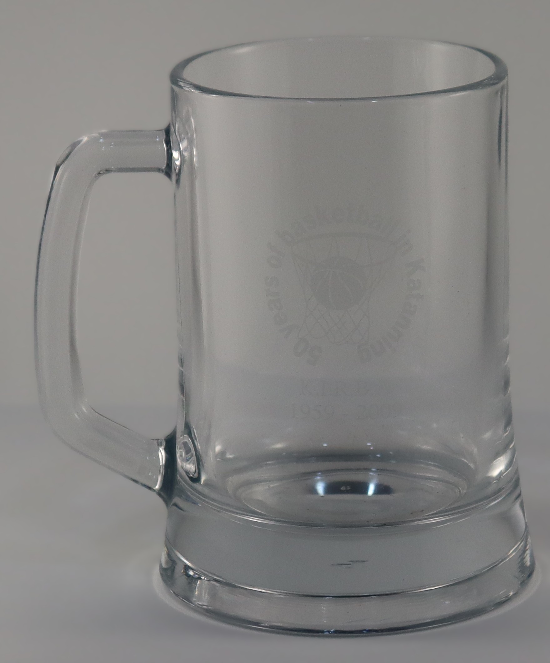 2009A glass drinking tankard, which has an etched drawing of a basketball falling through a hoop.