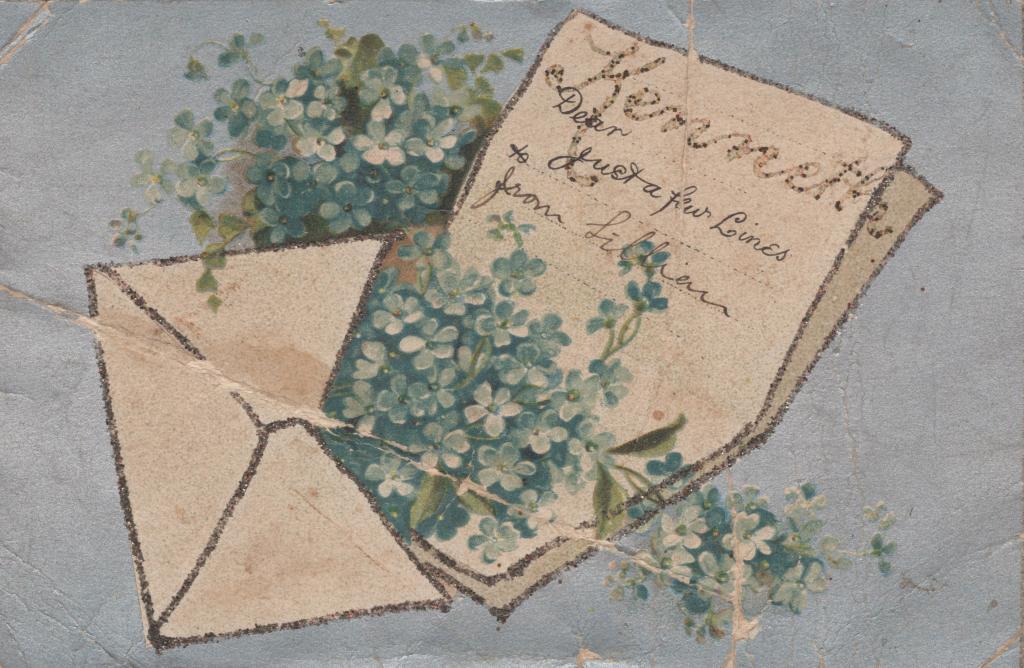 Horizontal metalic silver postcard with an image of a cream letter and a bunch of blue flowers coming out of a cream envelope. The letter and envelope are outlined in metallic glitter paint. The letter has printed on it 'Dear ___/ Just a few Lines / From ___' in curly type. 'Kenneth' is written above and right of the 'Dear' in glitter paint. 'Lillian' is handetiten in black ink after the 'From'.
