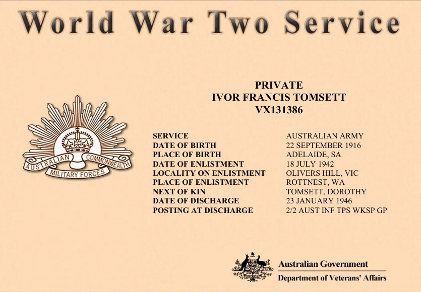 Private Ivor Francis Tomsett from Adelaide South Australia was serving on Rottnest as W when he volunteered for the Australian Imperial Force as VX131386 on 18 July 1942.