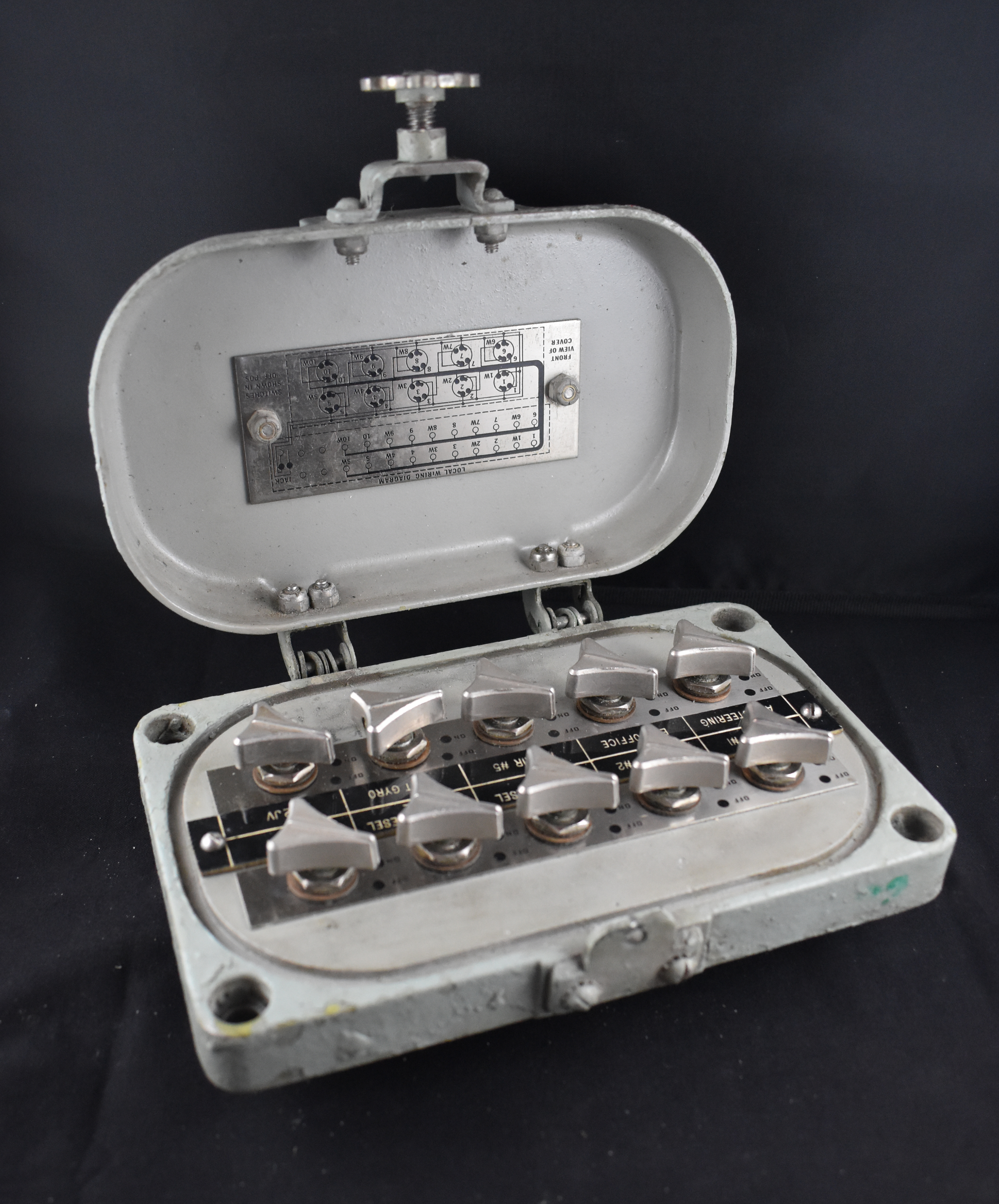 c. 1965Rectangular grey metal box which has a central plaque. In top is a small metal knob which unlocks to reveal ten (10) chrome-plated switches in the shape of arrows.
