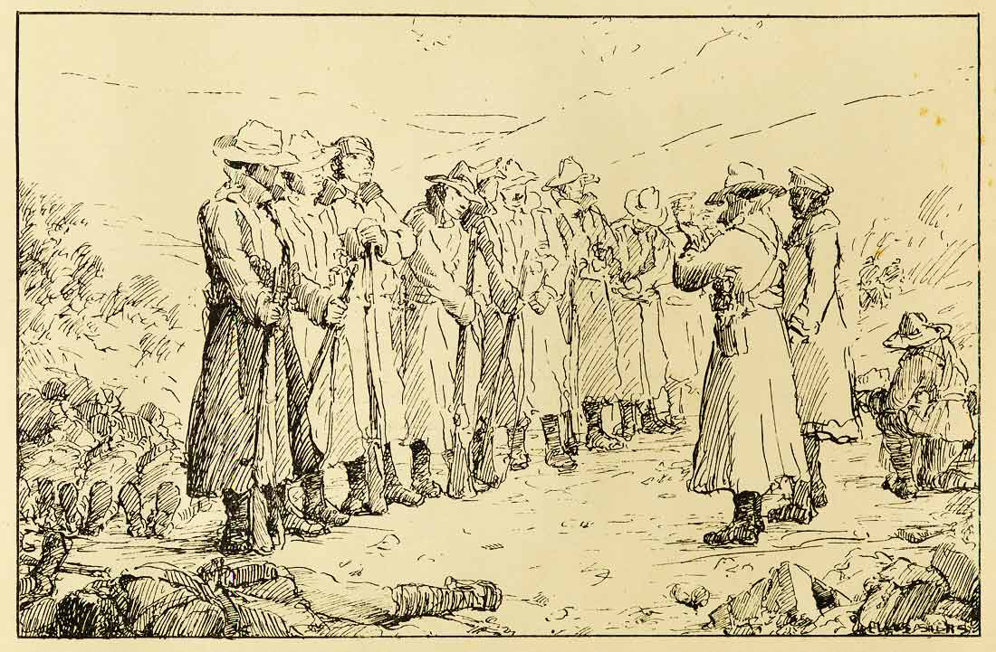 THIS is always a most heart-breaking incident. Name after name would be called; the reply – a deep silence, which could be felt, despite the noise of the incessant crackling of rifles and the screaming of shrapnel. This was taken the morning after the charge, on Sunday night, May 9th. We, the 16th Battalion, were supposed to be resting, and only to reinforce if the necessity arose. Unfortunately, through some error, we were sent into the firing line, At dawn, the following morning, there were few of us left to, answer our names when the roll was called – just a thin line of weary ashen-faced men. The bodies on the right we were unable to bury for some days, as we were so hard pressed by the Turks.