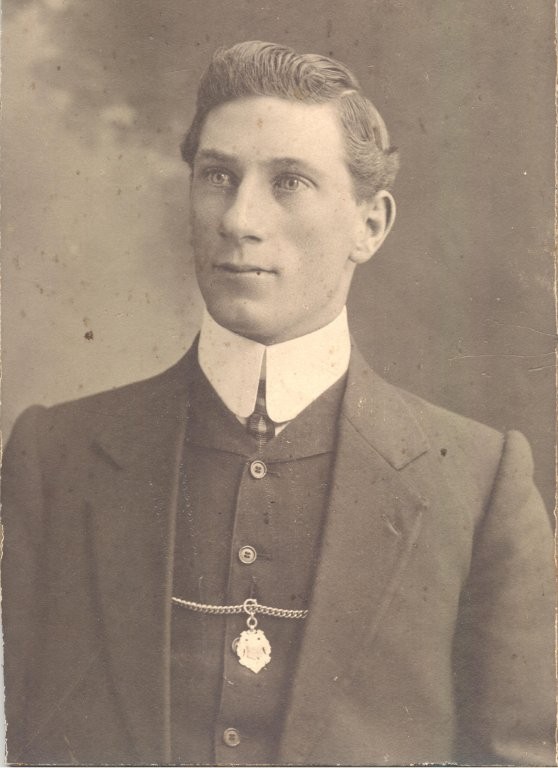 B/W Print. Head & shoulders studio photo of Bert Porter. His hair is swept back and he is wearing a dark jacket with collar and revers, a darker high buttoned waistcoat with revers and a stiff, high white collar and check tie. He has a watch chain across between the buttons with a medallion attached to the chain. Handwriten on rear [ Bert Porter/ Killed in 1st World War./ Husband of Annie had 1 son/ Brother of Ruth Efford./ (Mother of Sam, Ivy ...].