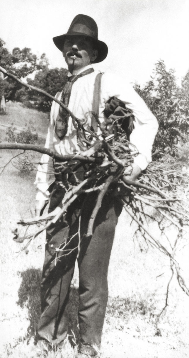 William Shaw in dark trousers, light coloured shirt and tie, dark braces and dark hat with an armful of firewood collected for a fire to boil a billy at a picnic on the river foreshore at the Bay Road reserve.