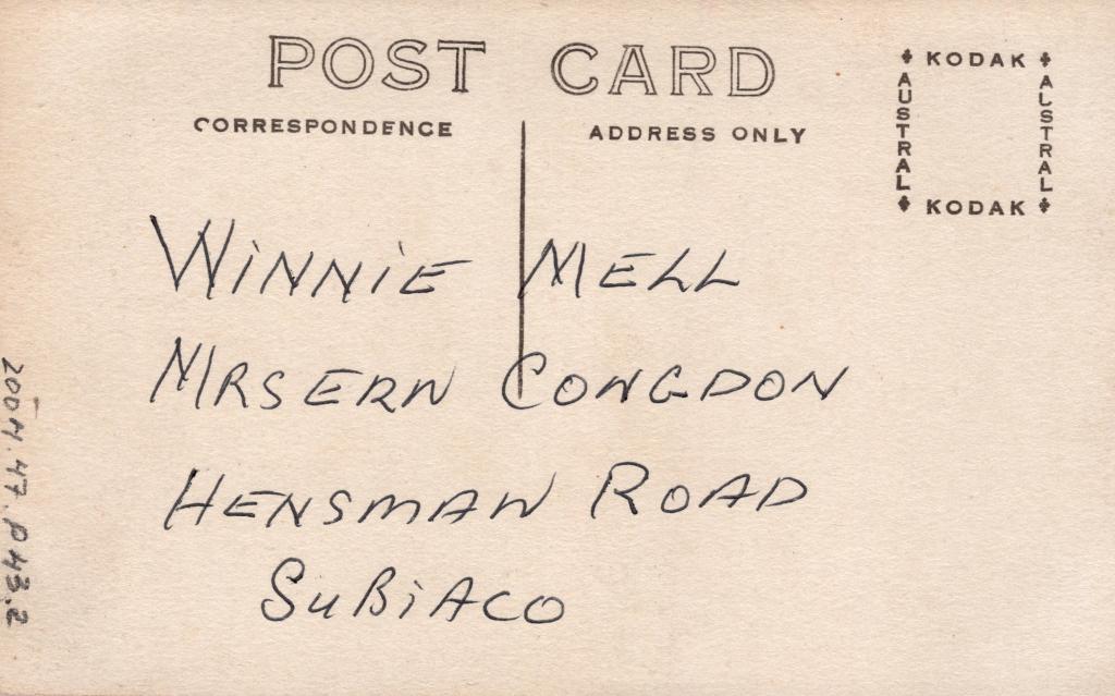 Reverse: Written in black pen 'WINNIE MELL MRS ERN CONGDON HENSMAN ROAD SUBIACO'