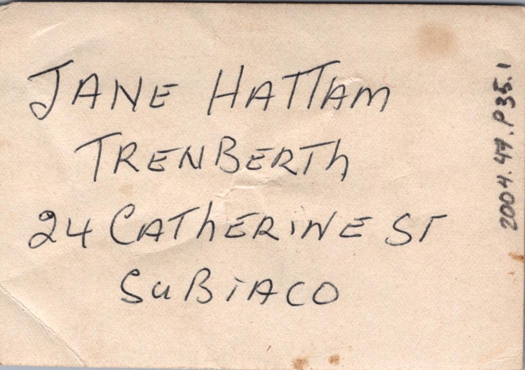 Reverse: Written in black pen 'JANE HATTAM TRENBERTH 24 CATHERINE ST SUBIACO'