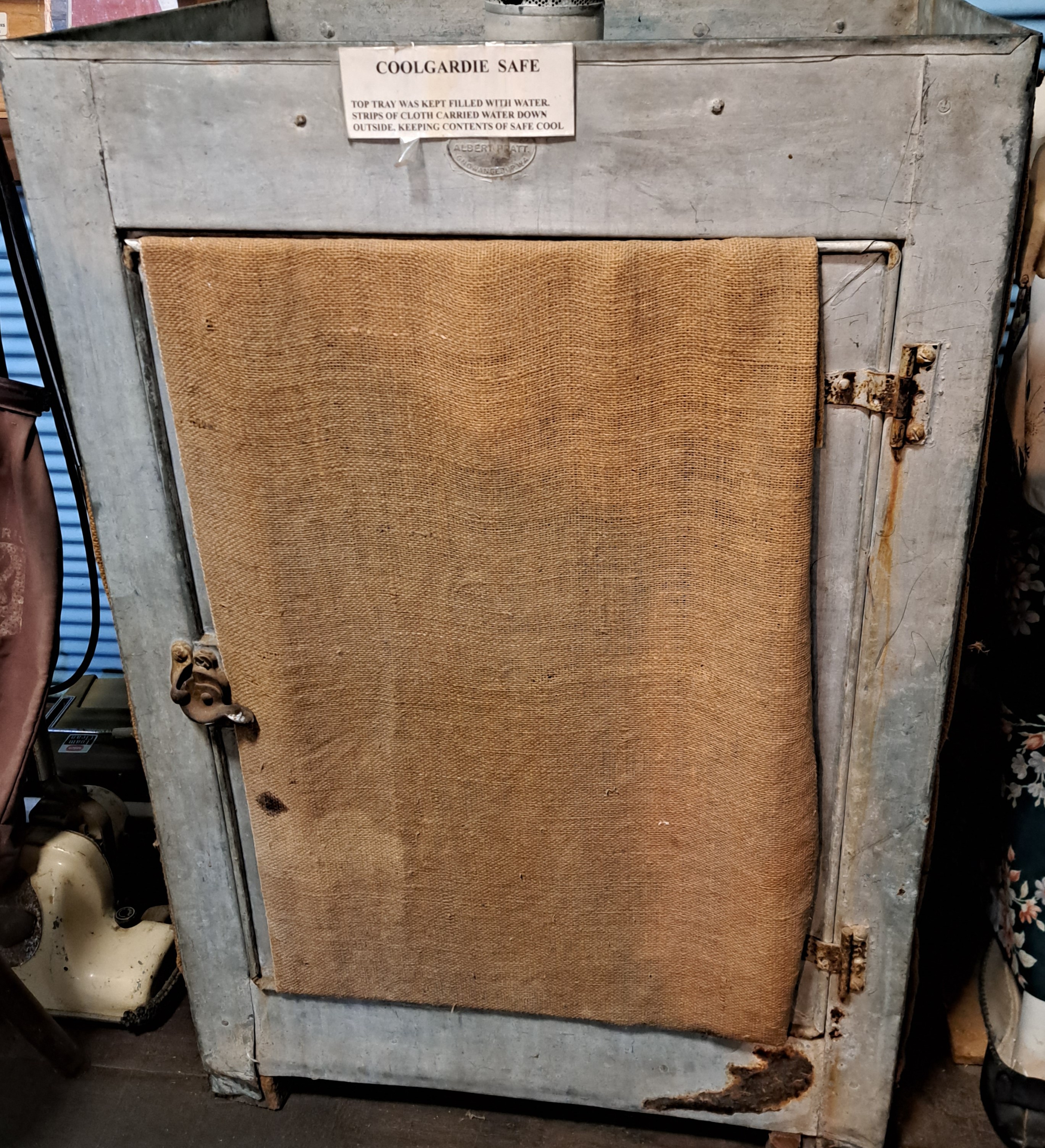 1914 - 1940square metal body frame with hessian bag covering all side walls, these metal walls are all perforated metal to allow air flow. The top of the Box shape has a tray type top to hold water in. The front door has perforated metal missing.