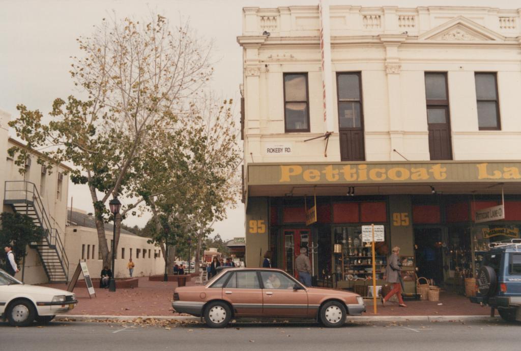 1988Coloured photograph showing an elevation of 'Petticoat Lane' at 95 Rokeby Road. The shop has a verandah with the name of the shop. There are cars parked on the road. A fewe people are seen around the shop. There are some trees to the left of the shop.