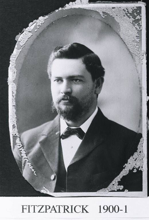 1900 - 19011 x B/W photographic bust portrait print of Mr. Patrick J Fitzpatrick. Image shows a youngish man, with a short, somewhat scruffy beard and moustache. He has dark wavy hair. He is wearing a dark jacket with a dark waistcoat, white turned down collar and checked bow tie. Printed beneath [FITZPATRICK 1900-1].