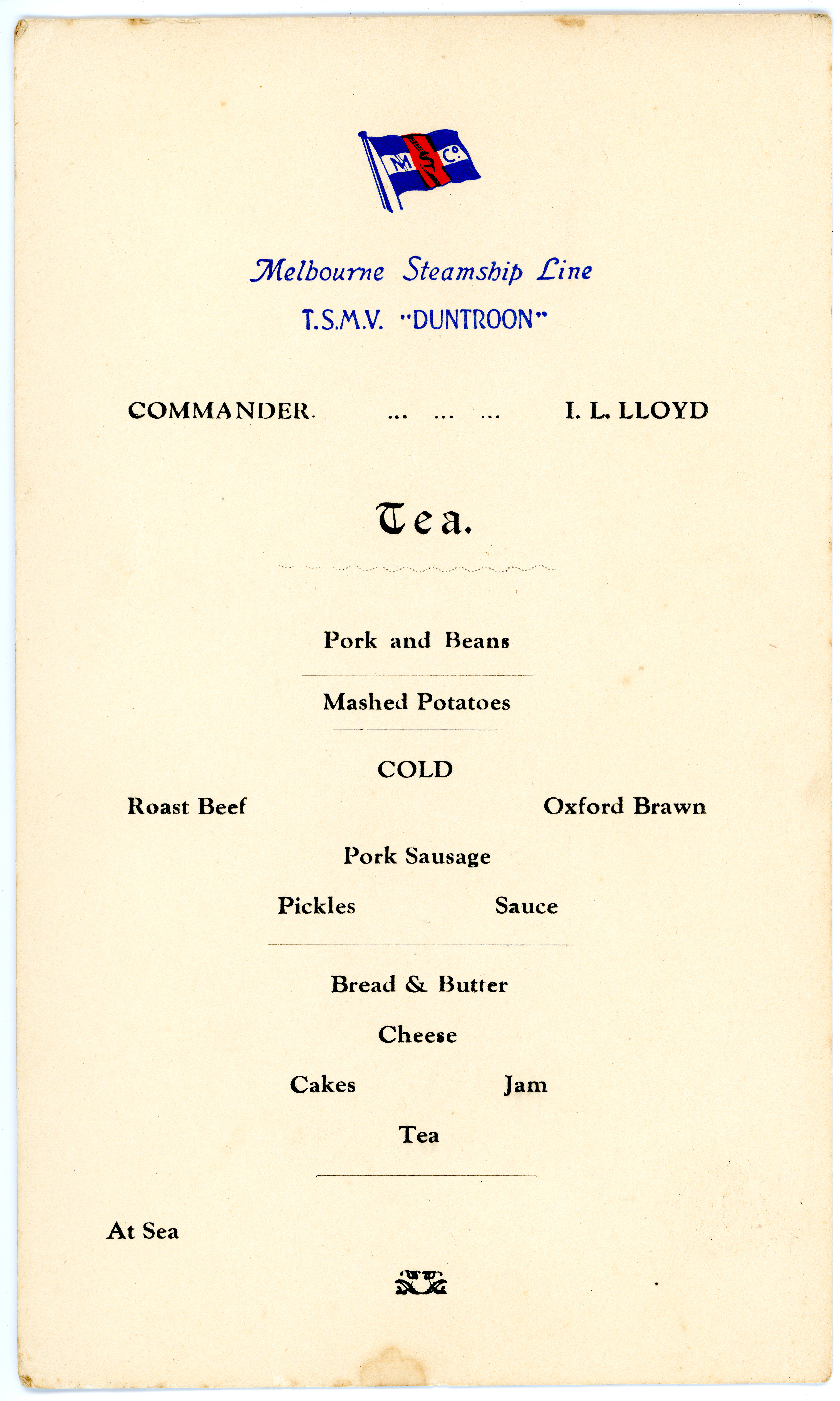 Tea Menu Card from the “Melbourne Steamship Line T.S.M.V. ‘DUNTROON’