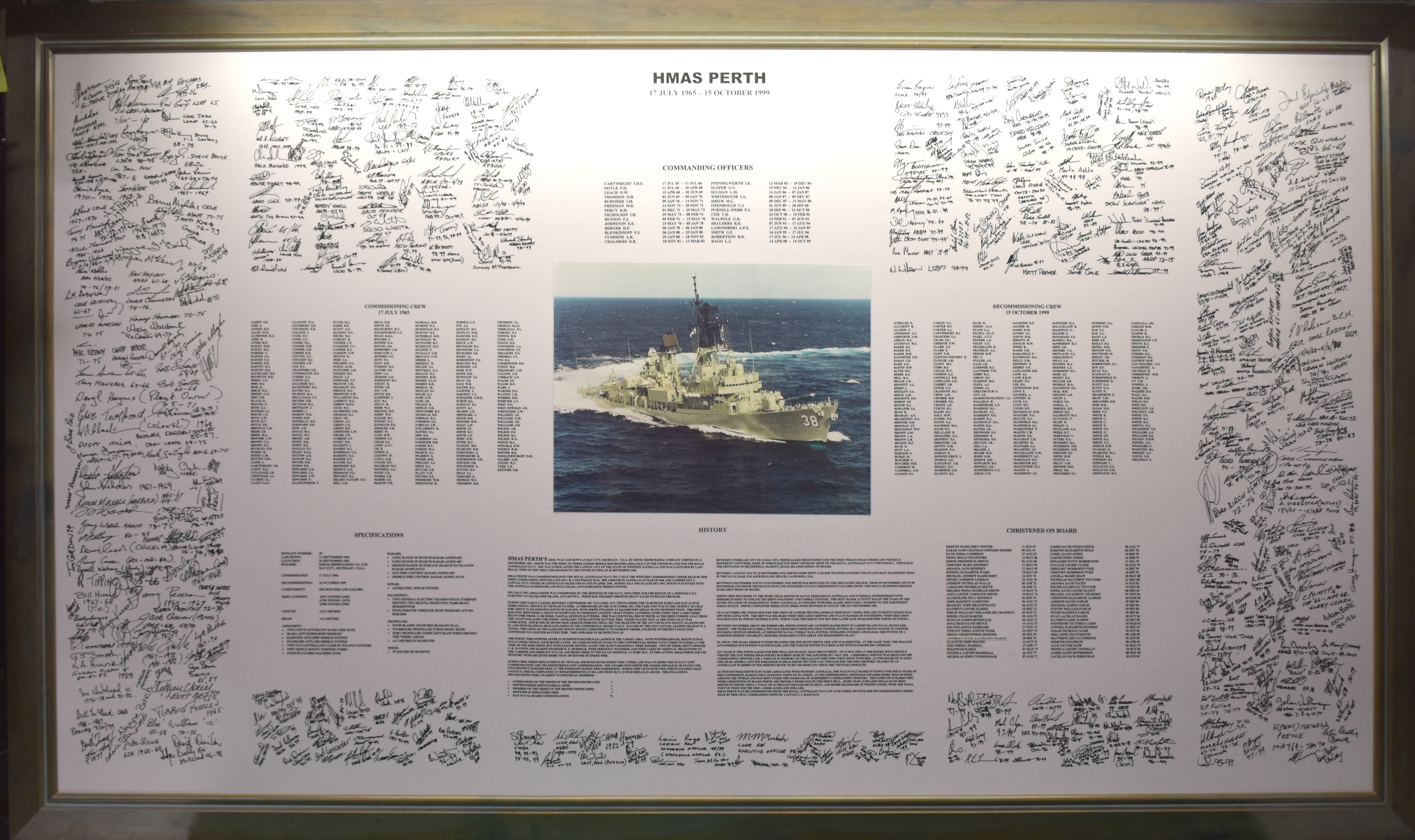 c. 20001Large framed colour picture of HMAS Perth II surrounded by several lists of names and signatures of those who served on her plus specifications and those who were christened on board.