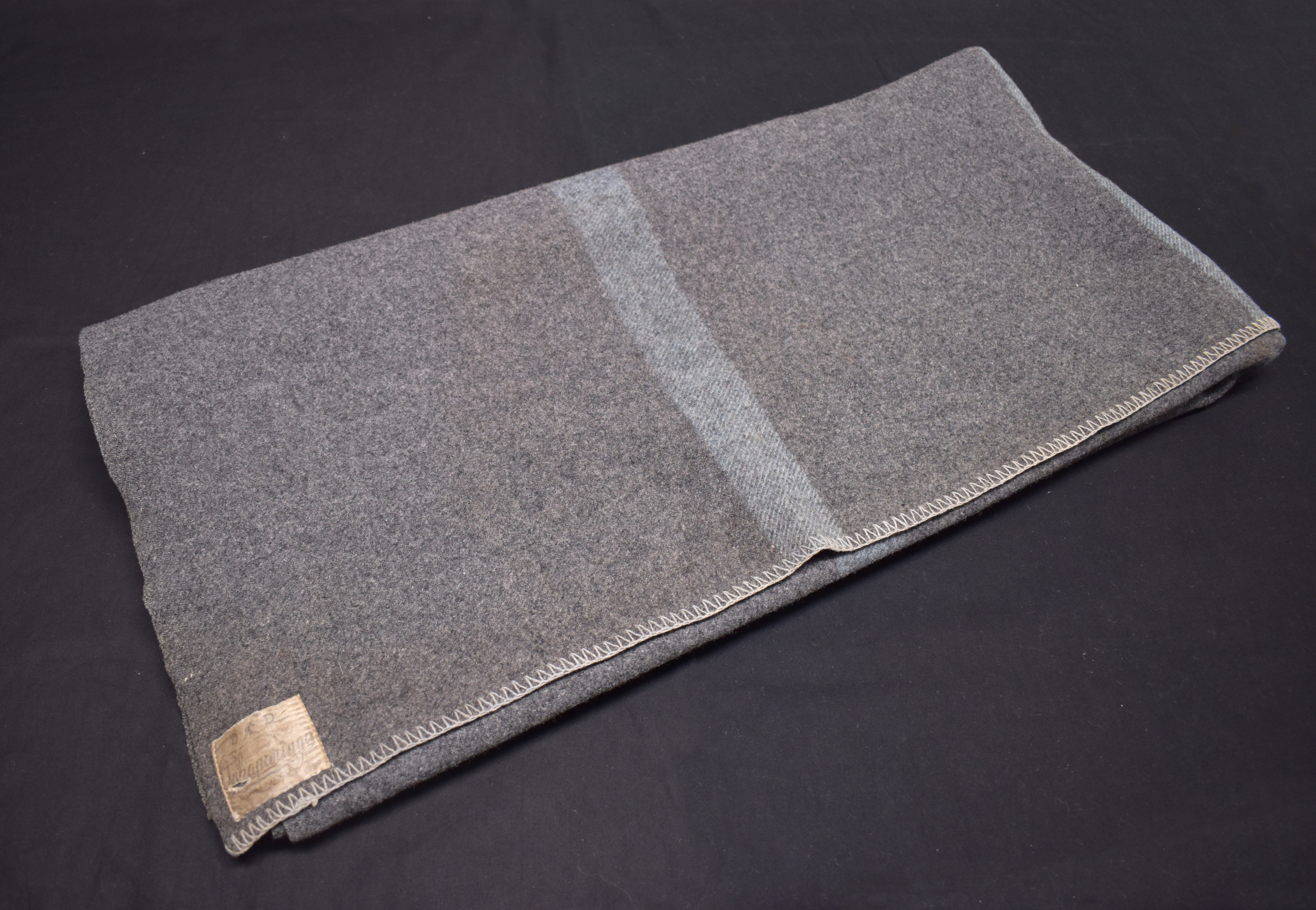 1952Dark grey woollen blanket with three (3) 45mm light grey strips spaced across running the full length of the blanket. Light blue blanket-stitching on top and bottom edges that is very worn and missing along most of the edges. Has a small cotton machine-stitched makers label fixed to the lower lefthand side corner.