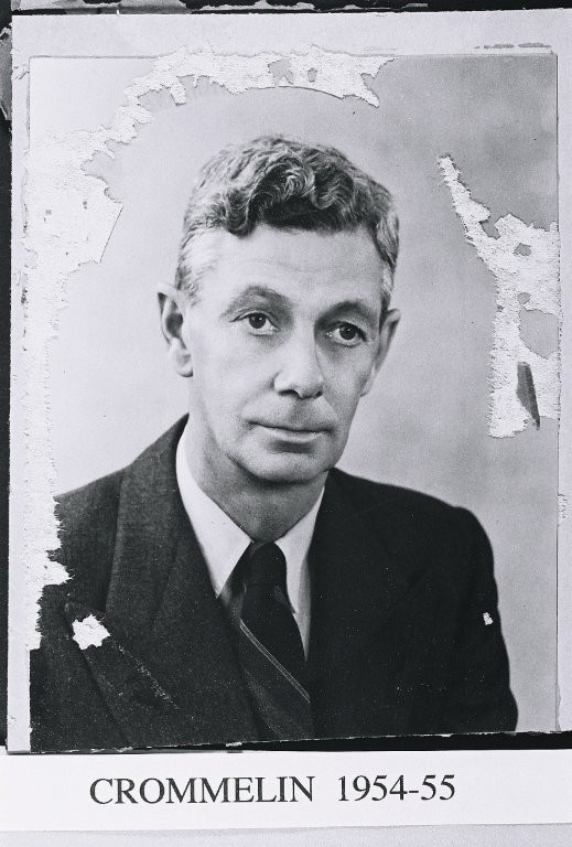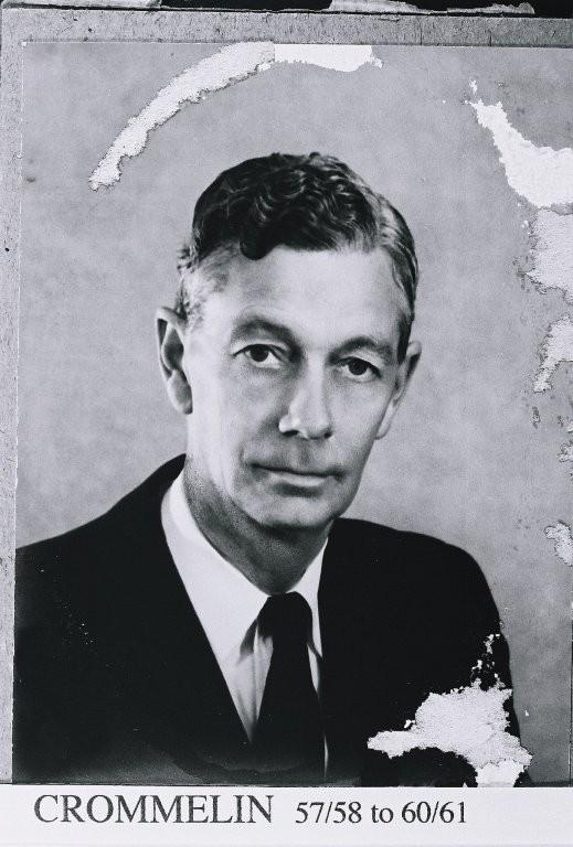 1954 - 19612x B/W Bust portrait prints of Harold William Crommelin 1954-1961. (a) Image shows a clean shaven mature man, with wavy hair. He is wearing a dark jacket with a white collared shirt and a diagonally striped tie. Printed beneath [CROMMELIN 1954-55]. (b) Similar to (a), he is wearing a dark jacket with a dark solid coloured tie. Printed beneath [CROMMELIN 57/58 to 60/61].