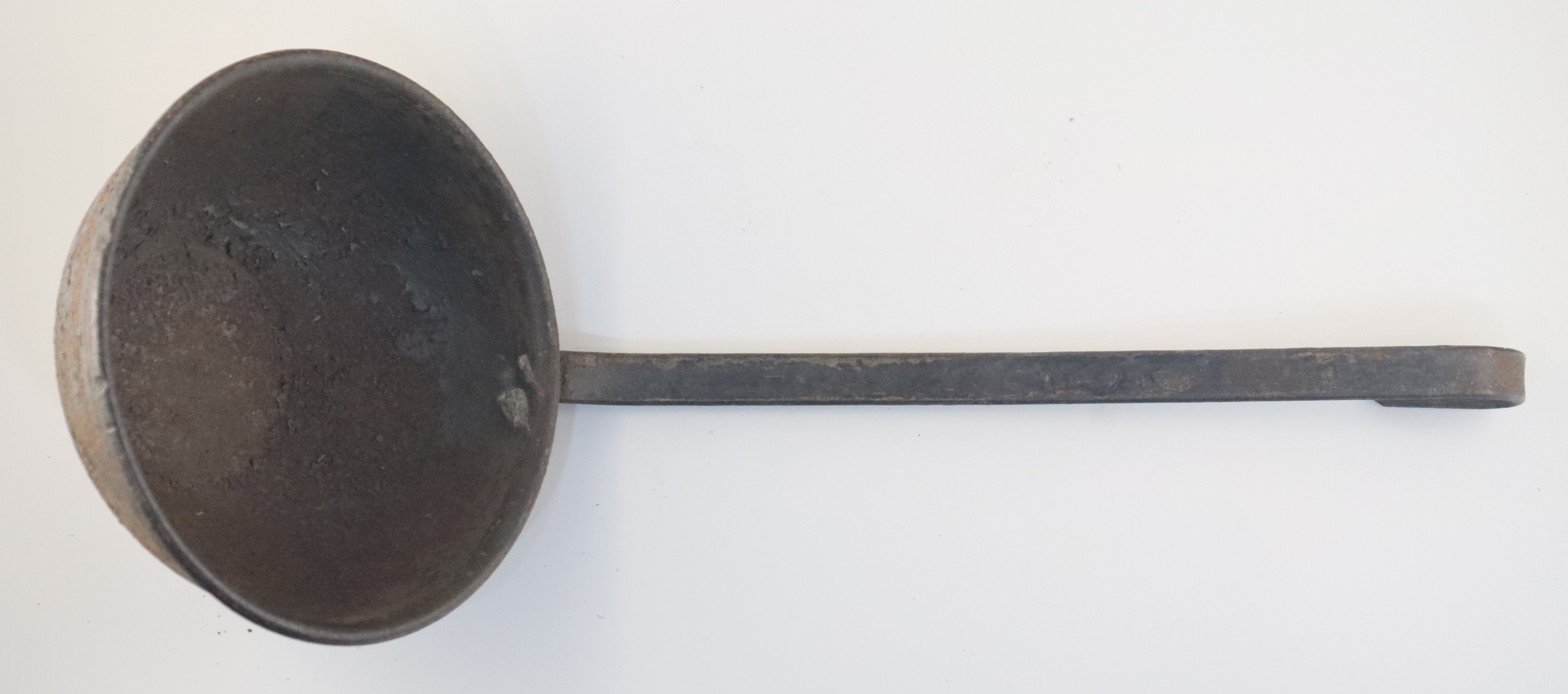 Metal ladle, used for serving soups or stews. Long metal handle with a circular deep scooped spoon.