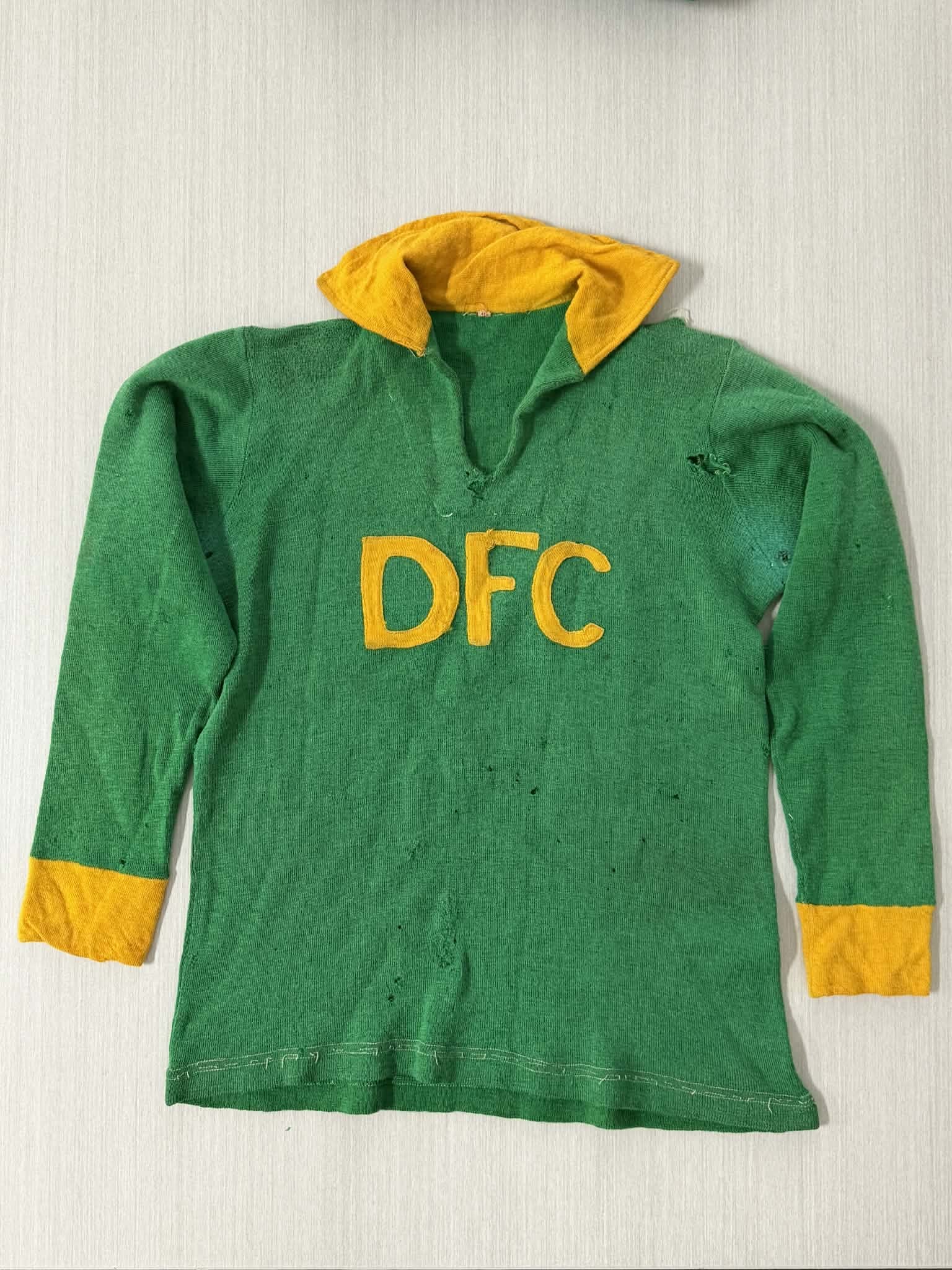 Green knitted woolen jumper with golf cuffs, collar and DFC applique on front. 13 applique on rear of jumper.