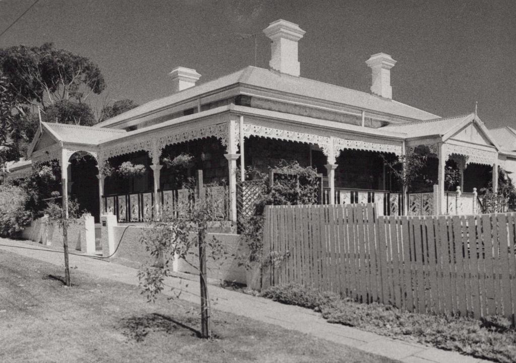 1985Black and white photograph of an unknown house in Subiaco. There is a verandah supported by decorated wooden beams. There is a decorative lattice framework attached beneath the roof of the verandah. The verandah has a fence. There are three chimneys on top of the roof. There is one gable seen to the left and one gable to the right. Both the gables have a finial fixed on top. There is a fence in front of the house connecting to a wall with an opening leading to the house. There is a pathway going past the house. There is a grass patch in front of the pathway. There are some small trees, shrubs and bushes in front of the house. Large trees are seen in the top left corner in the background.