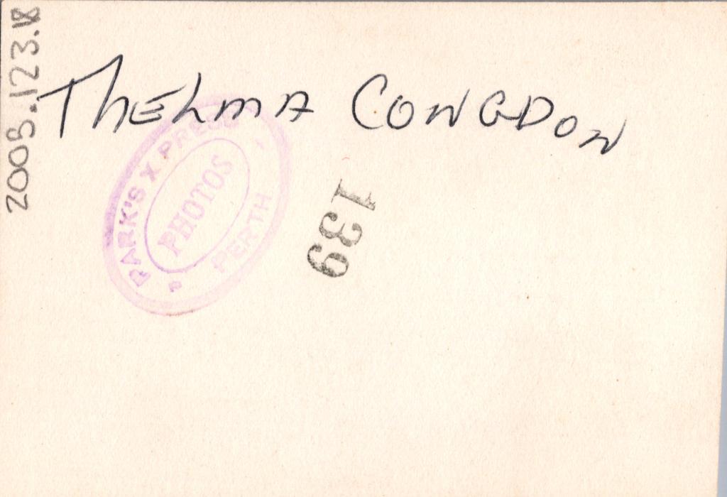 Reverse: Handwritten in black pen 'THELMA CONGDON'. Stamped on the back with a purple oval stamp reading 'PARK'S PHOTO PERTH' and a number '139' stamped in black.