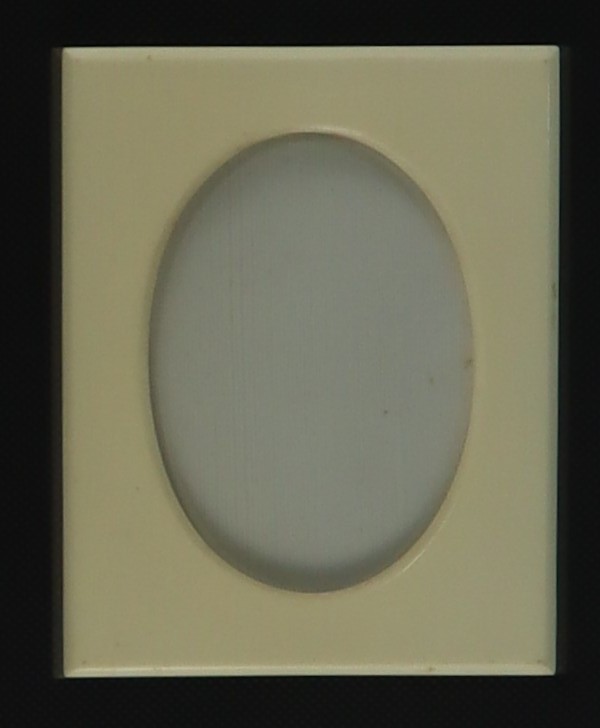 c. 1850 - 1940A cream rectangular shaped photo frame oval opening in centre for photo. There is an opening in the back to insert photo.