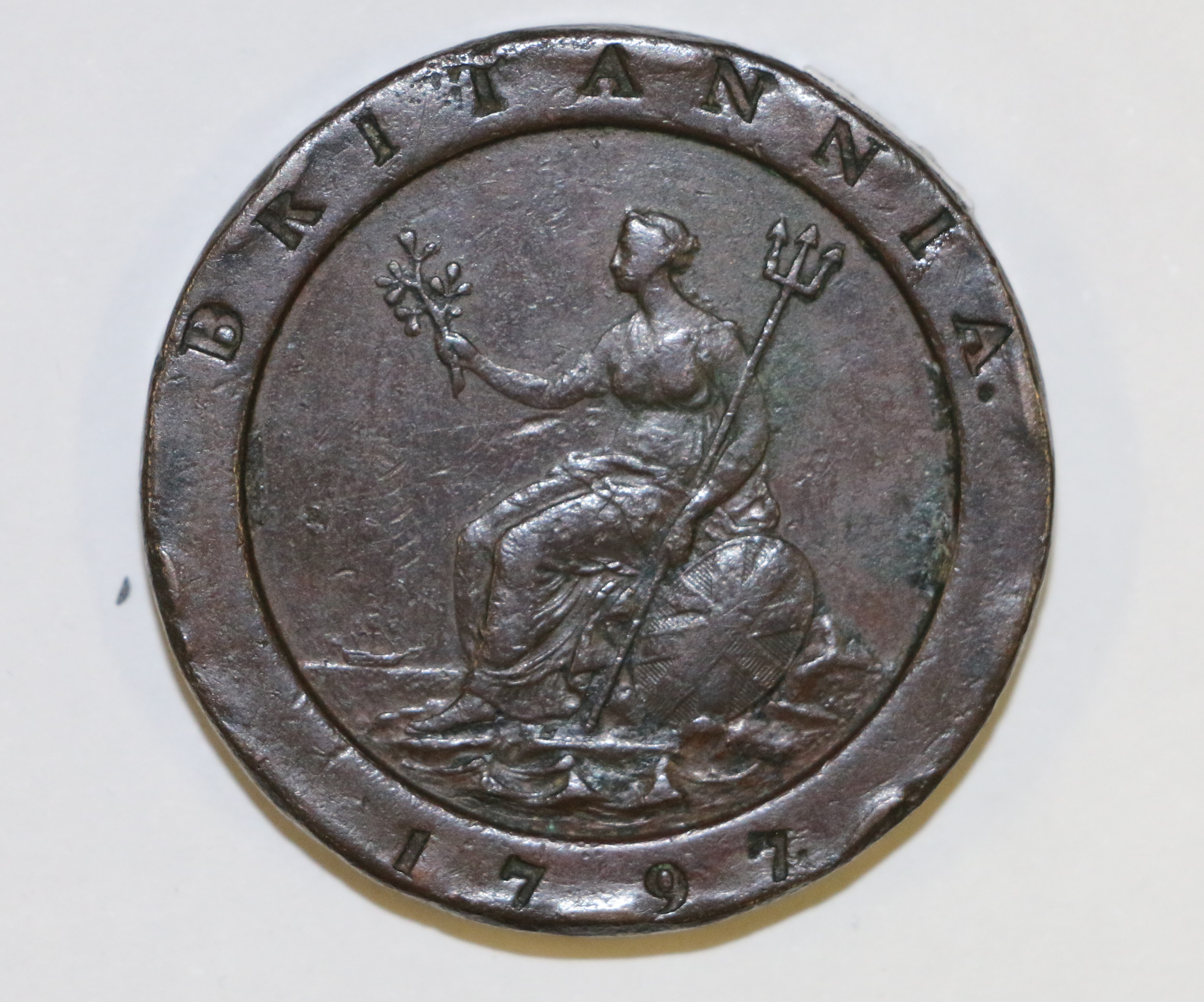 Large copper coin, scratched and dented. Front shows an image of Britannia with her trident and shield with the union flag, she is also holding an olive branch. In very small letters under her shield is the word SOHO. On her left, near her feet is a small ship. There is a raised rim which has " BRITANNIA" on the top and "1797" on the bottom. On the back is and image of King George III in Roman style wearing a toga and a wreath on his head. The raised rim has "GEORGIUS III . D:G . REX" written on it.