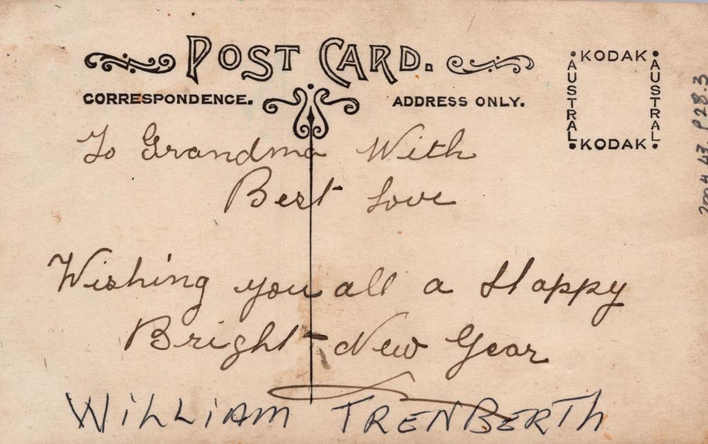 Reverse: Written in black pen 'To Grandma with best love wishing you all a happy bright new year' and 'WILLIAM TRENBERTH'