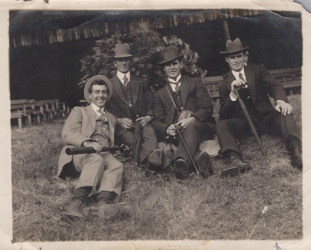 c. 1913Postcard showing four people sitting on the grass. One of them is Hallmon Trenberth.