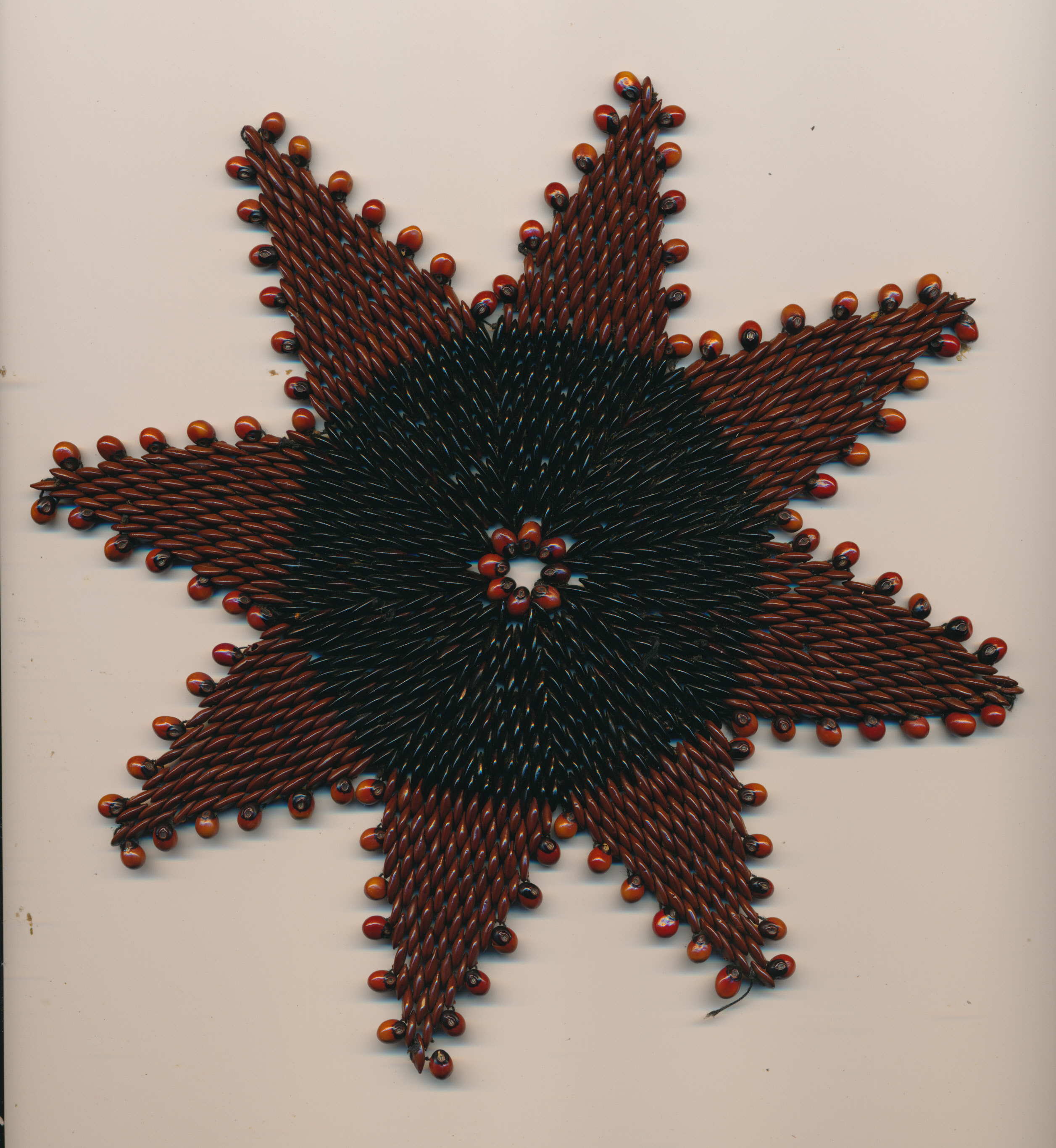 c. 1945A star shaped mat of black and brown oblong seeds and round brown seeds around the edges of the star. The centre is eight brown seeds which are then surrounded by a large circle of black seeds, the points of the star are worked in brown seeds.