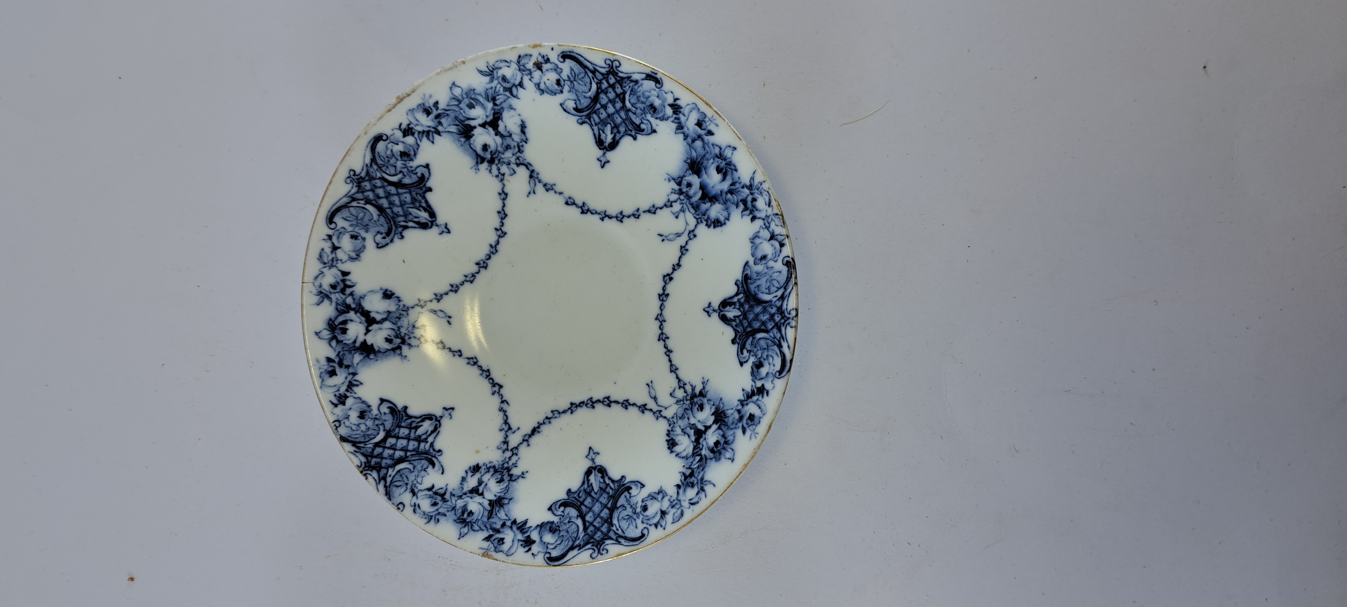 white saucer with decorative flower in dark blue, around edge.