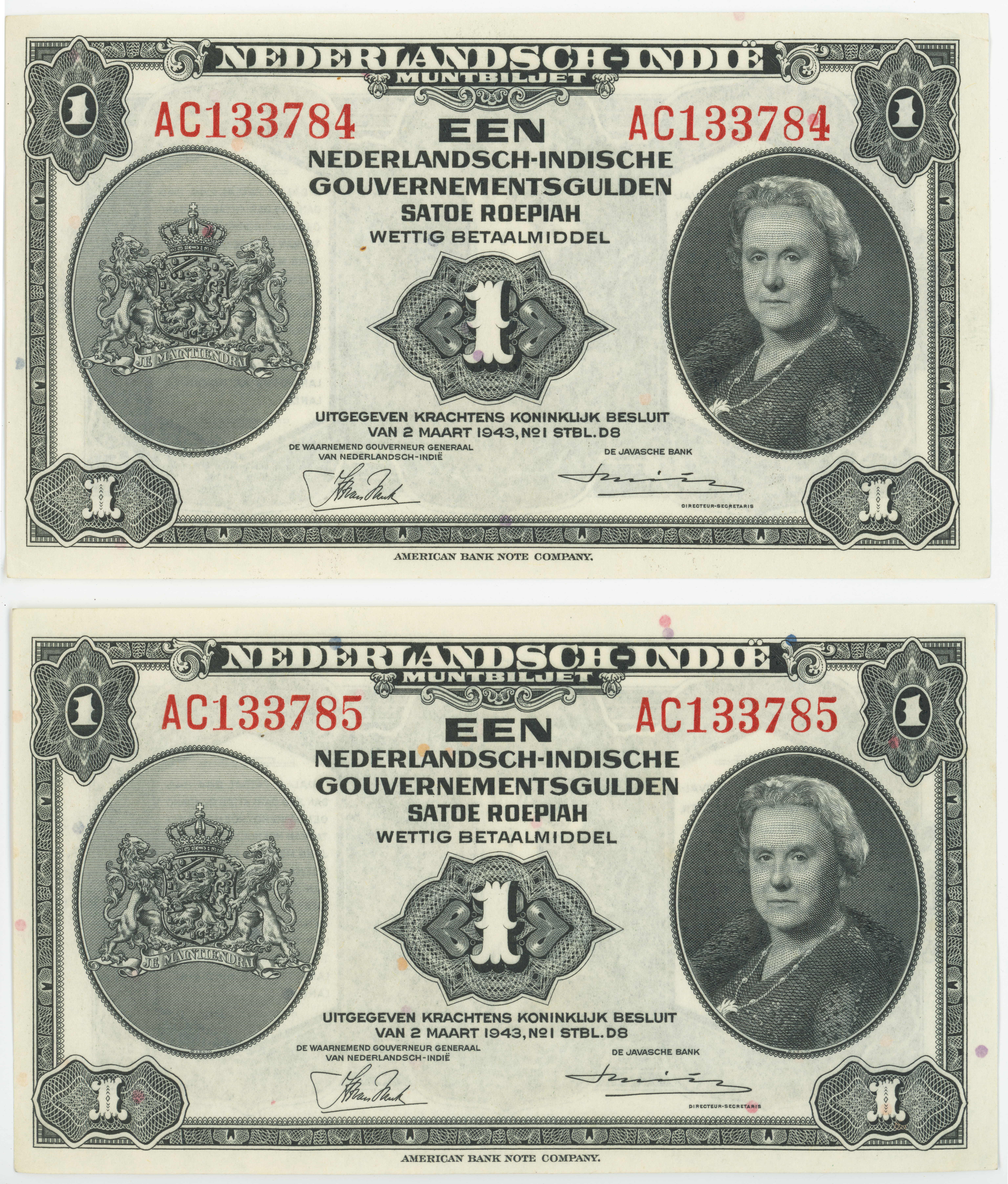1943A pair of consecutive one (1) gulden banknotes with black print on the obverse featuring a portrait of Queen Wilhelmina on the right-hand side and the coat of arms consisting of a pair of lions underneath a crown with an inscription on the left-hand side of each note. These appear within a frame with the denomination of the banknote in the centre and in each corner of the frame. The notes have consecutive numbers printed in red while all other printed information such as the issue date of 2 March 1943 is in black. The signatures of the Acting Governor General of the Dutch Indies and the Director Secretary of the Javanese Bank are just above the lower edge of the frame. The printer’s name, “The American Bank Note Company” appears below the frame.