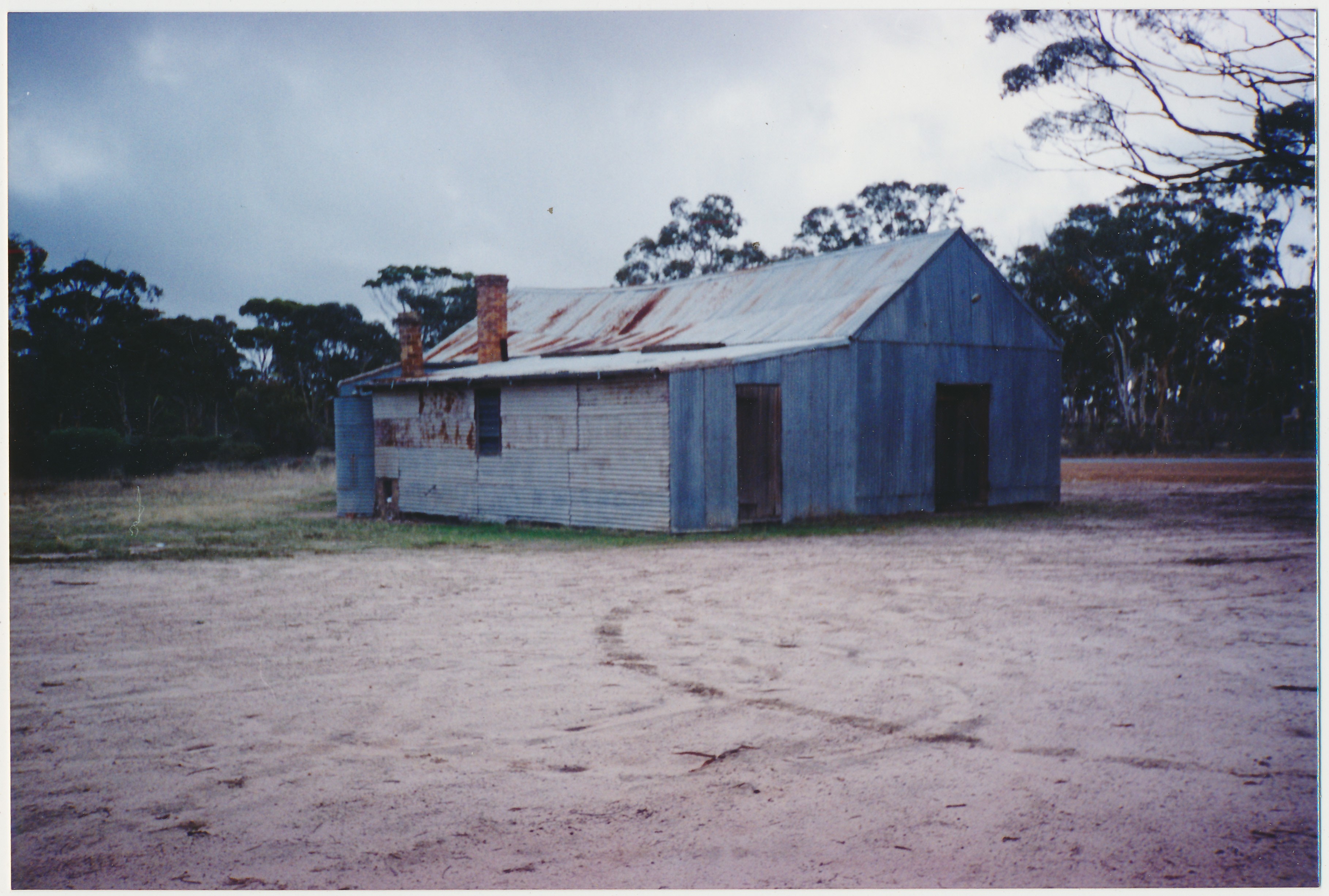 c. 1995A coloured photograph rear diagonal view of a tin building. The photograph is taken diagonally at the rear of the building looking back towards the road. There are two entrances to the hall and the brick chimney is visible.