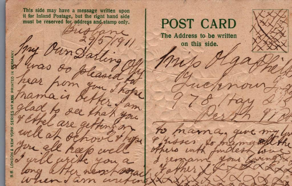 The reverse has a cursive message written in black ink, which is dated 'Brisbane / 29/5/1911'. The message is addressed to 'Miss(?) Olga Philp at '978 Hay St / Perth, WA' on the right hand side. The message is written by Olga's father and reads: