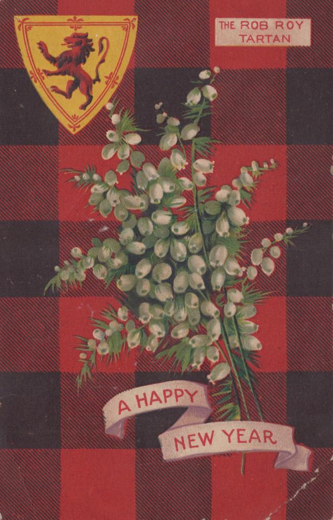 1911Vertical postcard in red and black tartan labelled as 'THE ROB ROY / TARTAN' in the top right corner. There is a bouquet of white heather in the middle with a white banner below which reads ' A HAPPY / NEW YEAR' in red text. There is The Lion Rampant (the Royal Banner of Scotland) - a yellow crest with a red lion - in the top left corner. The lion is facing ledt, in its hind legs and surrounded by a recorative border. The image surface has scraped away along the edges, the bottom right corner has a fold mark and the corners are stubbed.
