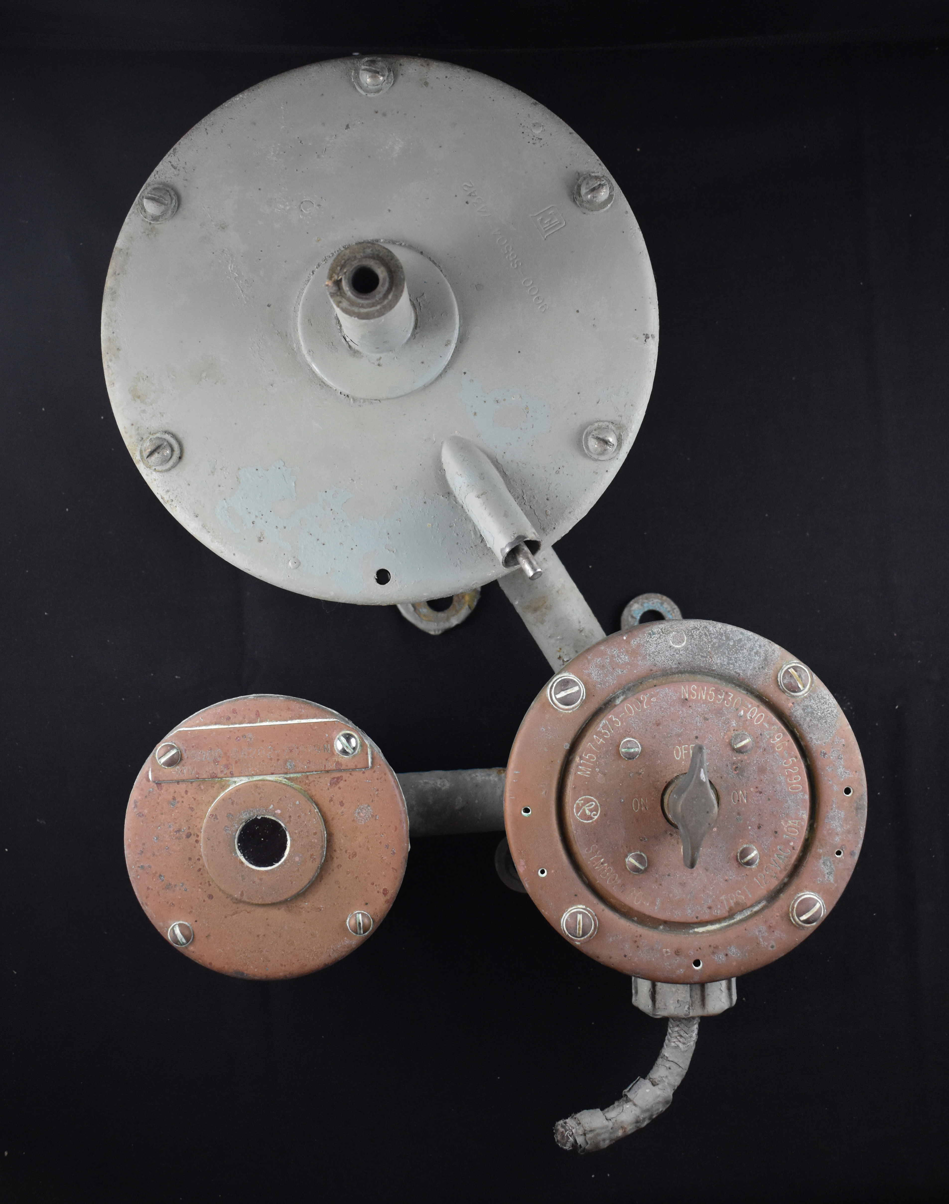 c. 1965Three (3) part section consisting of a tarnished brass switch, tarnished brass indicator light, and grey painted junction connected together with piping. Switch has power cord at base.