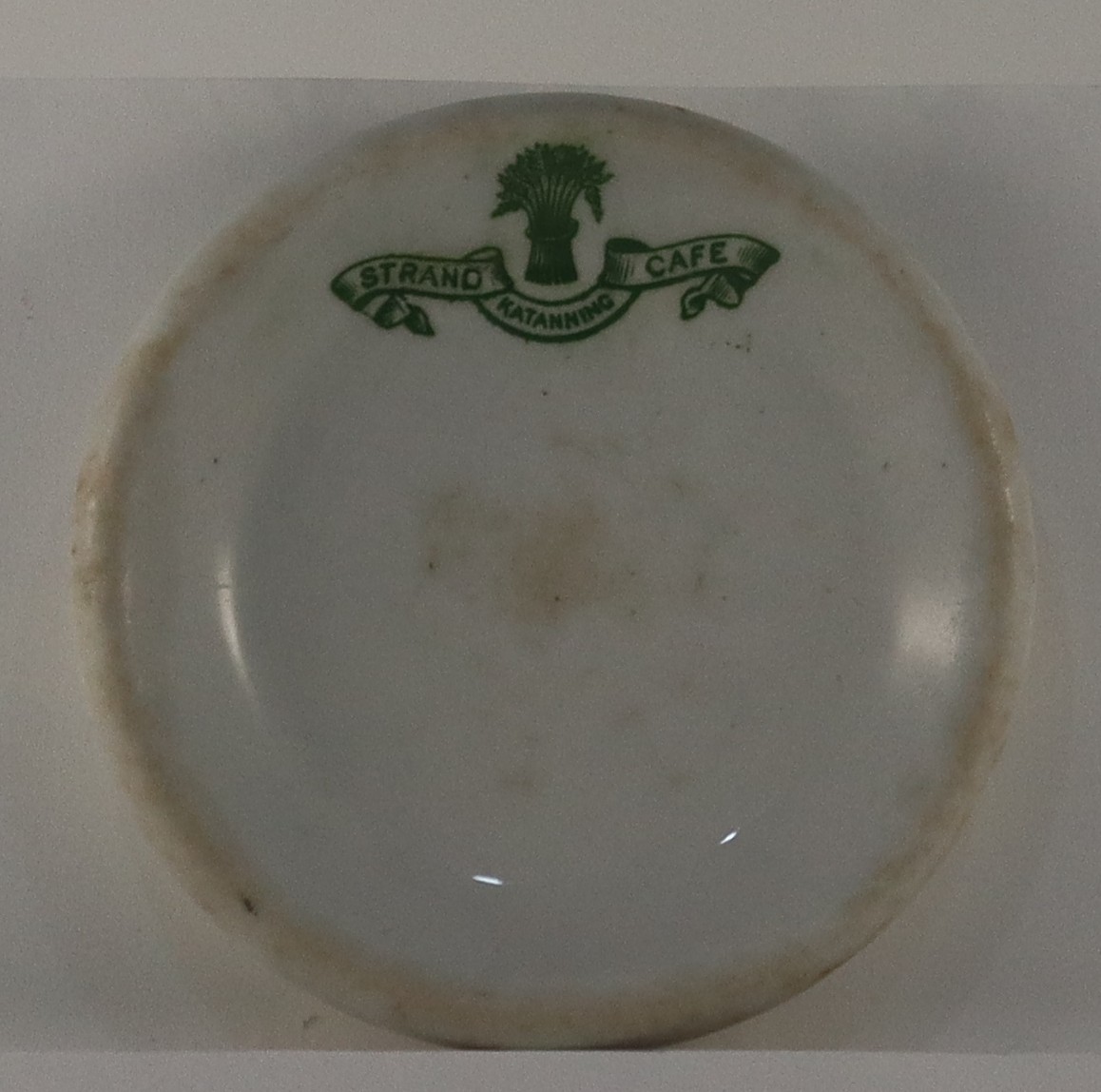 In the ribbon scroll in dark green lettering is "STRAND KATANNING CAFE".